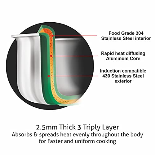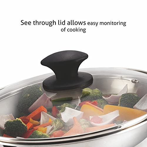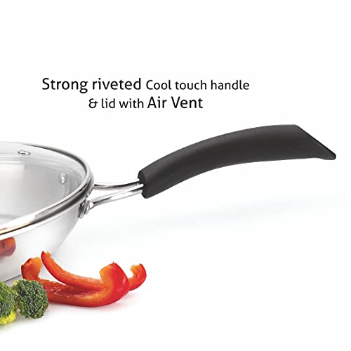 "The Alda Bueno Tri Ply Stainless steel fry pan is a must have cookware in a modern kitchen. It is perfect for making eggs tampering and heating up a small quantity of dry food. It comes with strong cool touch long handle angled perfectly for ease of use. The flared sides help food to cook quickly and let moisture escape for the browning of food without steaming. The see through lid with handle is an added advantage.