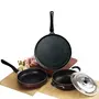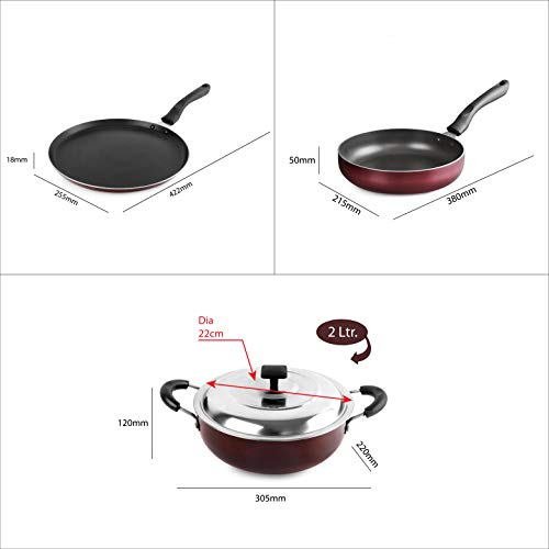 • Material: Aluminium Lid: Stainless Steel; Size: Kadhai Capacity - 2 Litres Dosa Tawa: 422mmx255mmx18mm Fry Pan - 380mmx215mmx50mm; Base type: Non Induction Base; Base thickness: 2.5mm; Colour: Cherry