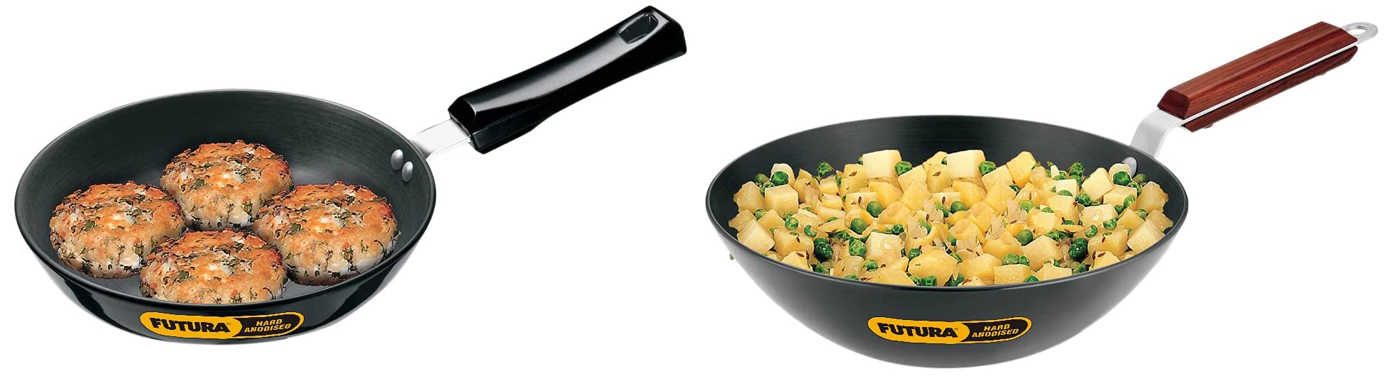 Pattern:Frying Pan + Tadka PanHawkins Futura Hard Anodised Flat Bottom Deep-Fry Pan 2.5 Litre L20All Futura Hard Anodised Deep-Fry Pans are distinguished by elegant comfortable rosewood handles fixed on sturdy stainless steel brackets which are permanently rivetted to the pans. All (except the smallest pan) have a flat bottom for stability. All have curved sides suitable for deep-frying and stir-frying.Hawkins Futura Hard Anodised Frying Pan 22cmThe extra thickness of the Futura Hard Anodised Frying Pans helps you cook without burning with minimal heat control. The instruction manual which comes with each frying pan gives easy tips for use and care as well as tested recipes. The handles whether plastic or stainless steel are stay-cool and comfortable. The frying pan with rounded sides has extra height to prevent spilling of food while stirring. The Tadka Pan (Spice Heating Pan) is designed for quick heating of flavourful spices and is also useful for melting butter or reheating small quantities of food.