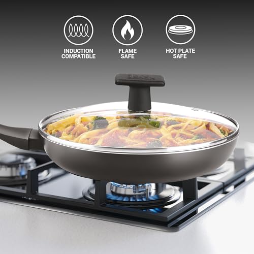 This induction compatible fry pan is strong & long-lasting due to the 3 mm thick body. Use the fry pan to cook delicious cutlets uttappa omelets stir-fry and more. The rounded sides and added height ensure less spillage of food outside the pan. The fry pan is perfect for busy cooks who seek durable performance in the kitchen every day.