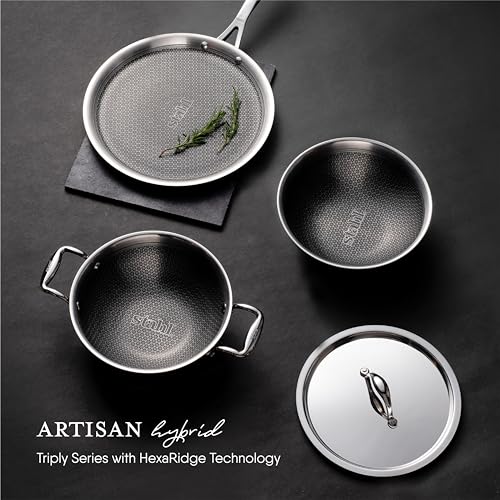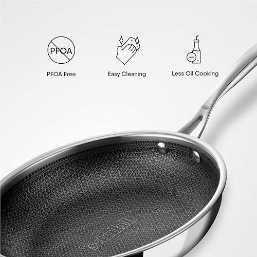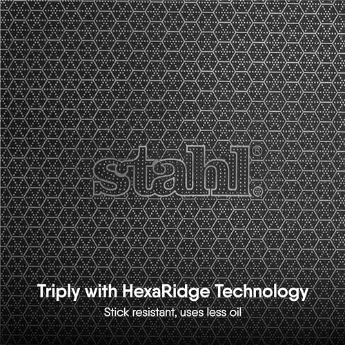 The Stahl NevrStick series is the latest development of our Artisan Range our latest development offers all the benefits of the Artisan series plus: HexaRidge Technology: The german technology coating is embedded in the honeycomb structure. The ridges of the honeycomb structure are elevated so that there is contact of the spatula on the coating giving it 5x the life of any other coated pan on the market. It is so good you can use a metal object on it or even a knife. The Stahl Artisan our most premium range is designed for enthusiasts experts and anyone who believes in having the best. It boasts of quality safe and enjoyable cooking experience. Any Artisan product is manufactured with utmost care and precision ensuring an impeccable feel and finish with fantastic utility and efficiency. This Stahl cookware item has a three layers sandwiched together through the entire body of the utensil which provides an unparalleled cooking experience. HANDLES: This Artisan range of Stahl products is fitted with custom-made Investment Cast Stainless Steel handles and a professional Stainless Steel Lid.