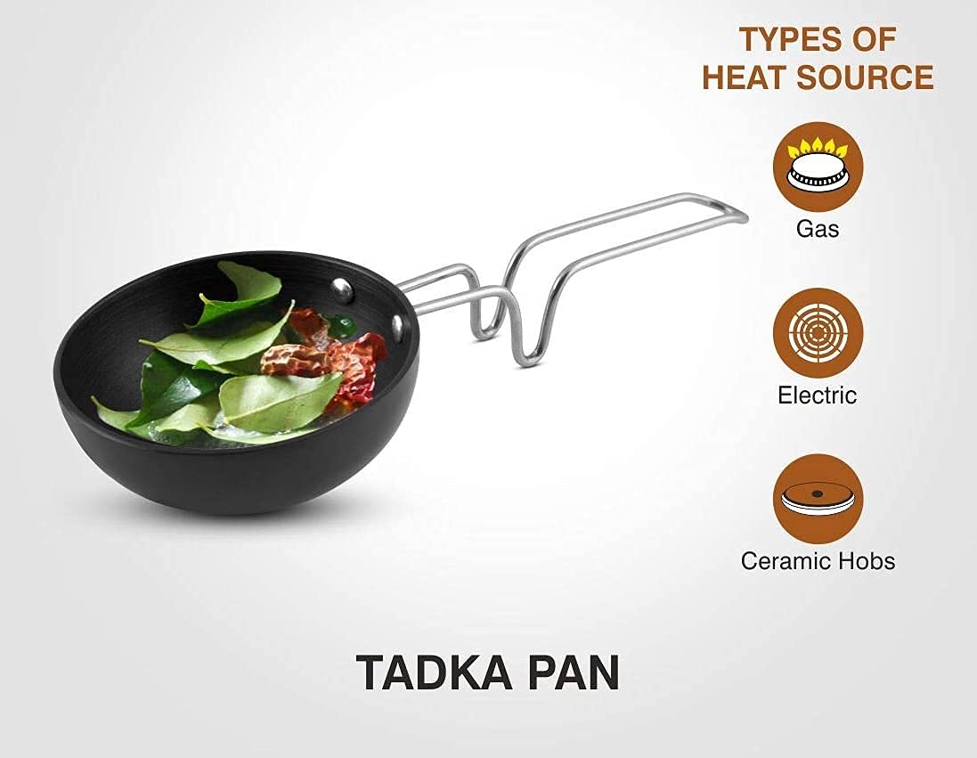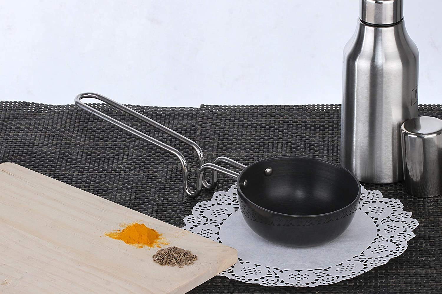 Product description:-This pan is made of Heavy material for long Durability & steel handle for your saftety.This Tadka Pan that is ideal for making tadka for dal rasam sambhar and other gravies.A tadka pan is a rounded and deeped bottomed pan used for frying searing and browning foods. It is designed for lower heat cooking method.These tadka pan are ideal for making those Dal tarka shambar thadka and more tadka making.The benefit of cooking on tadka pan is same as iron tawa. Always store the pan in a clean and dry place away from water and moisture.Small Non Stick Pan - Perfect toasting spices and more - this small pan is the ideal size for small cooking requirements.