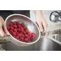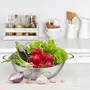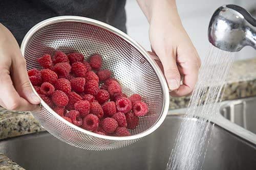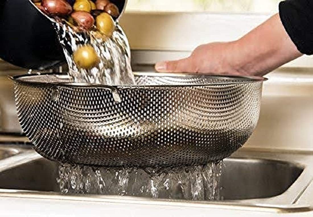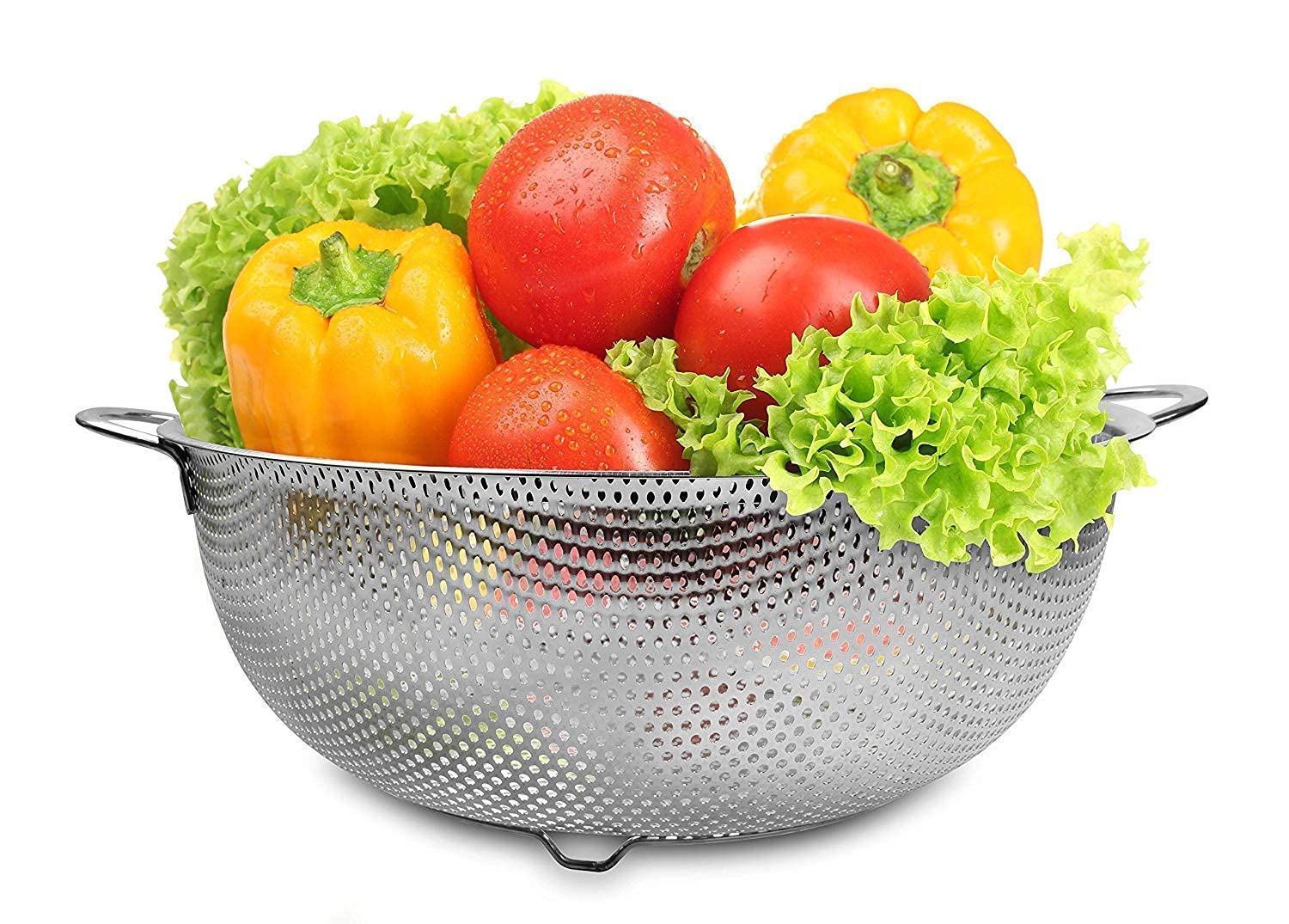 it is perfect for draining and rinsing foods such as pasta/ seafood/ fresh fruits/ salads/ herbs and vegetables The unique leaf design makes the colander extremely flexible. Stainless steel colander is made of durable and attractive stainless steel with a sturdy base and convenient side handles. The product has been made attractive with the bright color. Bend squeeze or twist the adaptable design will reduce spillages when pouring food into small containers and make it easier to strain all liquid. An ultimate kitchen gadget that collapses to a tenth of in-use size in one swift movement Multi-purpose usage; steam strain and serve. The holes in this colander are small enough that you can strain cooked grains including rice quinoas pasta and most beans pasta as well as fruits and vegetables without any worries of clogging. Our robust sieve holds onto your spaghetti noodles and stops small foods from falling through. Perfect to rinse sieve cooking and even as a vegetable steamer! With heavy-duty handles and elegant stand base Water will drop faster because of the base easy storage ways are also available like ear handles when you are not using it you can easily hang it with any stand or wall.