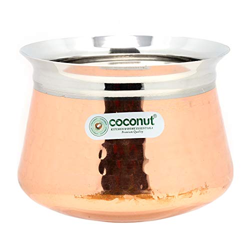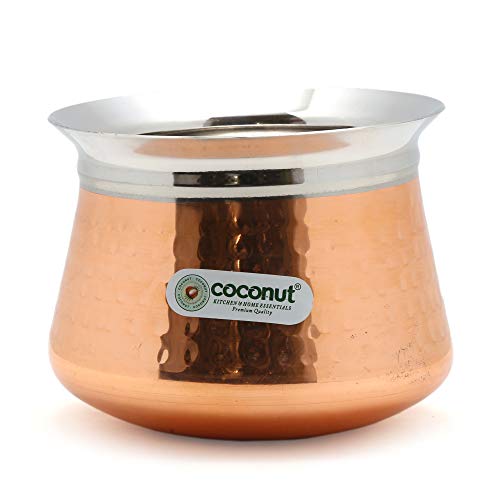 Coconut is a range of innovative and quality products for Home and Kitchen. This Iveo Handi is made from High Quality stainless steel with heavy guage for High Durability. Rust proof and Food Grade steel. Induction and Gas Friendly. Compaq size makes it easy to store in kitchen cupboards. Easy to clean and maintain. When not in use stack the smaller container inside bigger containers saving storage space. Ideal for daily use on your Gas Stove. Energy efficient. Heats evenly and cooks faster. Food will not stick to your pan. This Temple Handi comes with [ Without Handle and Lid]. Product content: Coconut Stainless Steel Hammered Copper Braun Handi 1 Unit. Product Dimension - - Width - 15 Cm Length -15 CM Height - 13 Cm. Capacity -1850Ml.