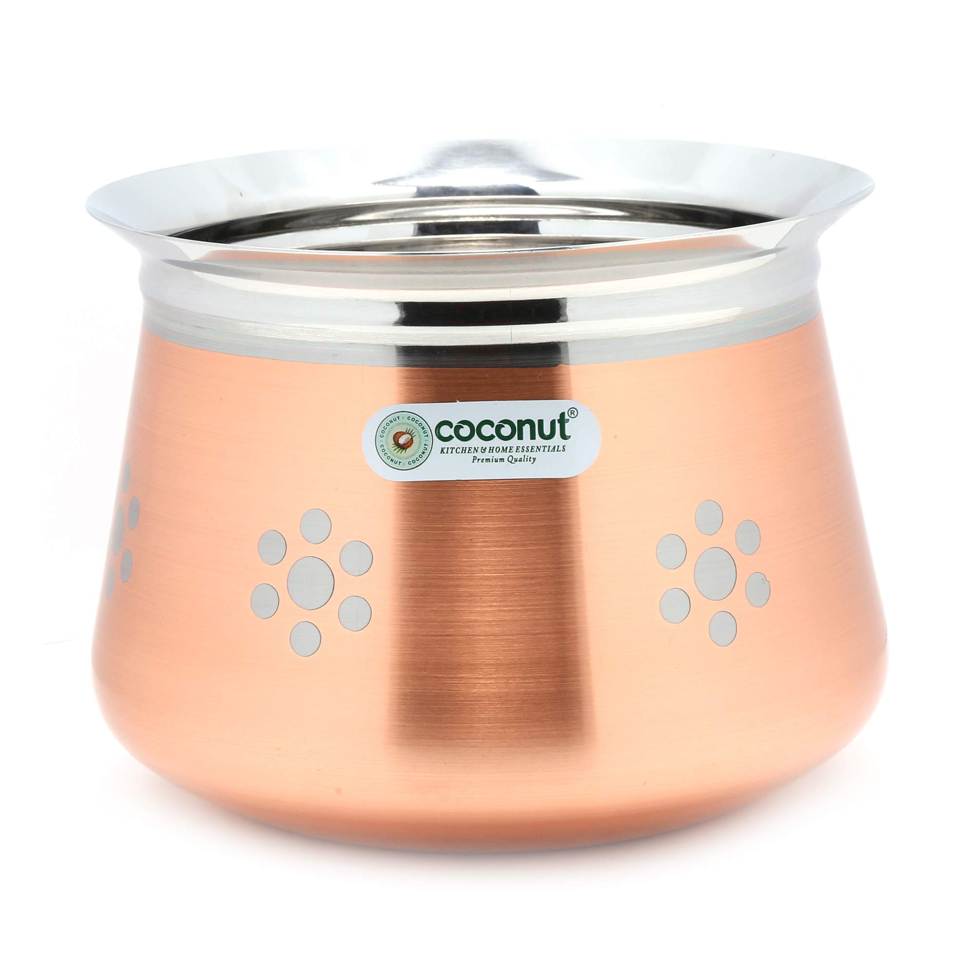 Coconut is a range of innovative and quality products for Home and Kitchen. This Iveo Handi is made from High Quality stainless steel with heavy guage for High Durability. Rust proof and Food Grade steel. Induction and Gas Friendly. Compaq size makes it easy to store in kitchen cupboards. Easy to clean and maintain. When not in use stack the smaller container inside bigger containers saving storage space. Ideal for daily use on your Gas Stove. Energy efficient. Heats evenly and cooks faster. Food will not stick to your pan. This Temple Handi comes with ( Without Handle & Lid).Product content: Coconut Stainless Steel Copper Cosmos Handi 1 Unit. Product Dimension - Iveo Handi No.5 - Width - 17 Cm Length - 17 Cm Height 14 CM.Capacity - 2600Ml.