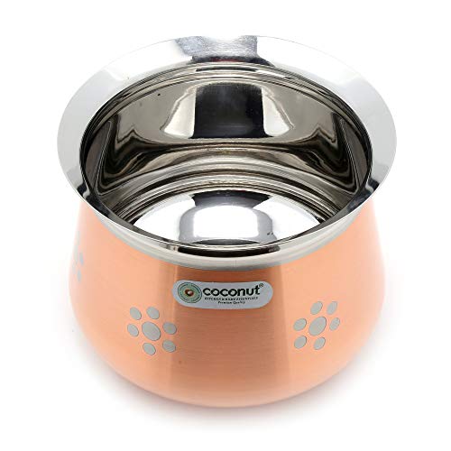 Coconut is a range of innovative and quality products for Home and Kitchen. This Iveo Handi is made from High Quality stainless steel with heavy guage for High Durability. Rust proof and Food Grade steel. Induction and Gas Friendly. Compaq size makes it easy to store in kitchen cupboards. Easy to clean and maintain. When not in use stack the smaller container inside bigger containers saving storage space. Ideal for daily use on your Gas Stove. Energy efficient. Heats evenly and cooks faster. Food will not stick to your pan. This Temple Handi comes with ( Without Handle & Lid). Product content: Coconut Stainless Steel Copper Cosmos Handi 1 Unit. Product Dimension - Iveo Handi No.2 - Width - 12.5 Length - 12.5 Height - 10 Cm.Capacity 850Ml.