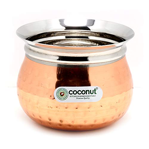 Coconut is a range of innovative and quality products for Home and Kitchen. This Iveo Handi is made from High Quality stainless steel with heavy guage for High Durability. Rust proof and Food Grade steel. Induction and Gas Friendly. Compaq size makes it easy to store in kitchen cupboards. Easy to clean and maintain. When not in use stack the smaller container inside bigger containers saving storage space. Ideal for daily use on your Gas Stove. Energy efficient. Heats evenly and cooks faster. Food will not stick to your pan. This Temple Handi comes with ( Without Handle and Lid). Product content: Coconut Stainless Steel Hammered Copper Iveo Handi 1 Unit. Product Dimension - Width - 12.5 Length - 12.5 Height - 10 Cm.Capacity - 850ML