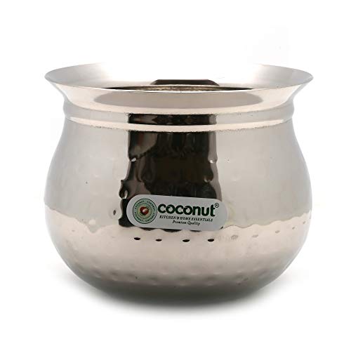 Coconut is a range of innovative and quality products for Home and Kitchen. This Iveo Handi is made from High Quality stainless steel with heavy guage for High Durability. Rust proof and Food Grade steel. Induction and Gas Friendly. Compaq size makes it easy to store in kitchen cupboards. Easy to clean and maintain. When not in use stack the smaller container inside bigger containers saving storage space. Ideal for daily use on your Gas Stove. Energy efficient. Heats evenly and cooks faster. Food will not stick to your pan. This Temple Handi comes with ( Without Handle & Lid). Product content: Coconut Stainless Steel Hammered Oreo Handi 1 Unit. Product Dimension - Iveo Handi No.2 - Width - 12.5 Length - 12.5 Height - 10 Cm.Capacity -850Ml.