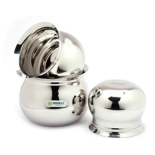 Product content: Coconut Kanchi Pure Stainless Steel Handi Set of 3 unit . Product Dimension - (Kanchi Handi Size -1 - Width 4.5 Inches Height 3.5 inches)