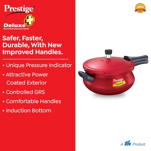 Deluxe Plus Aluminium Pressure Handi comes with induction base which makes it the most versatile pressure handi available. It can work on any heat source and enables you to cook delicious dishes in a smart way at the highest level of safety through its Pressure Indicator which rises above the lid under pressure and drops when the pressure inside falls to zero giving a visible indication to safely open the handi. The Deluxe plus Pressure Handi is aesthetically designed to give you the flavour of traditional Indian cooking.