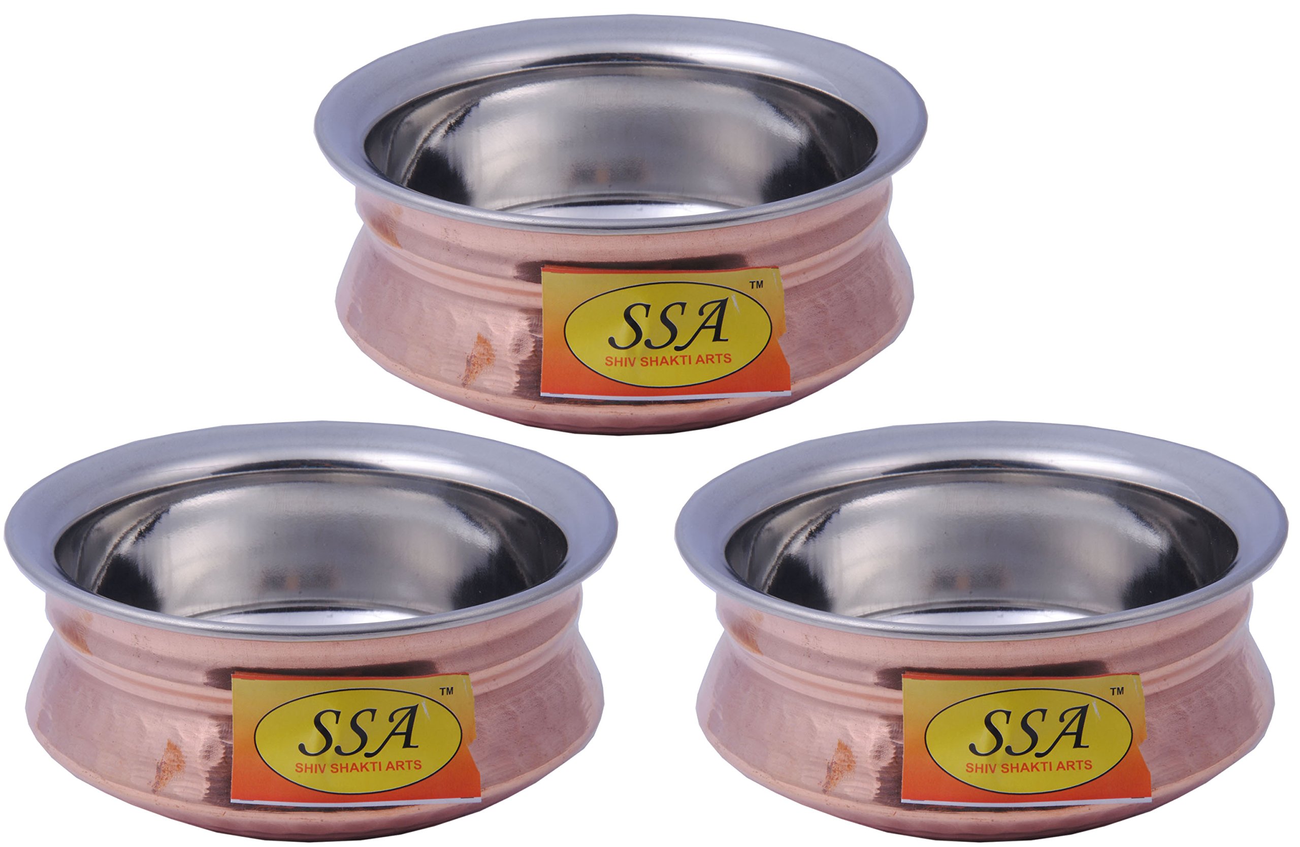 SHIV SHAKTI ARTS Handmade Pure Set of 3 Steel Copper Handi/Bowl/Bhagoni No 1 Hammered Design Bowl/Handi Volume=300 ml for Dinnerware Hotelware Giftware Item for Serving Curry and Dal Purpose