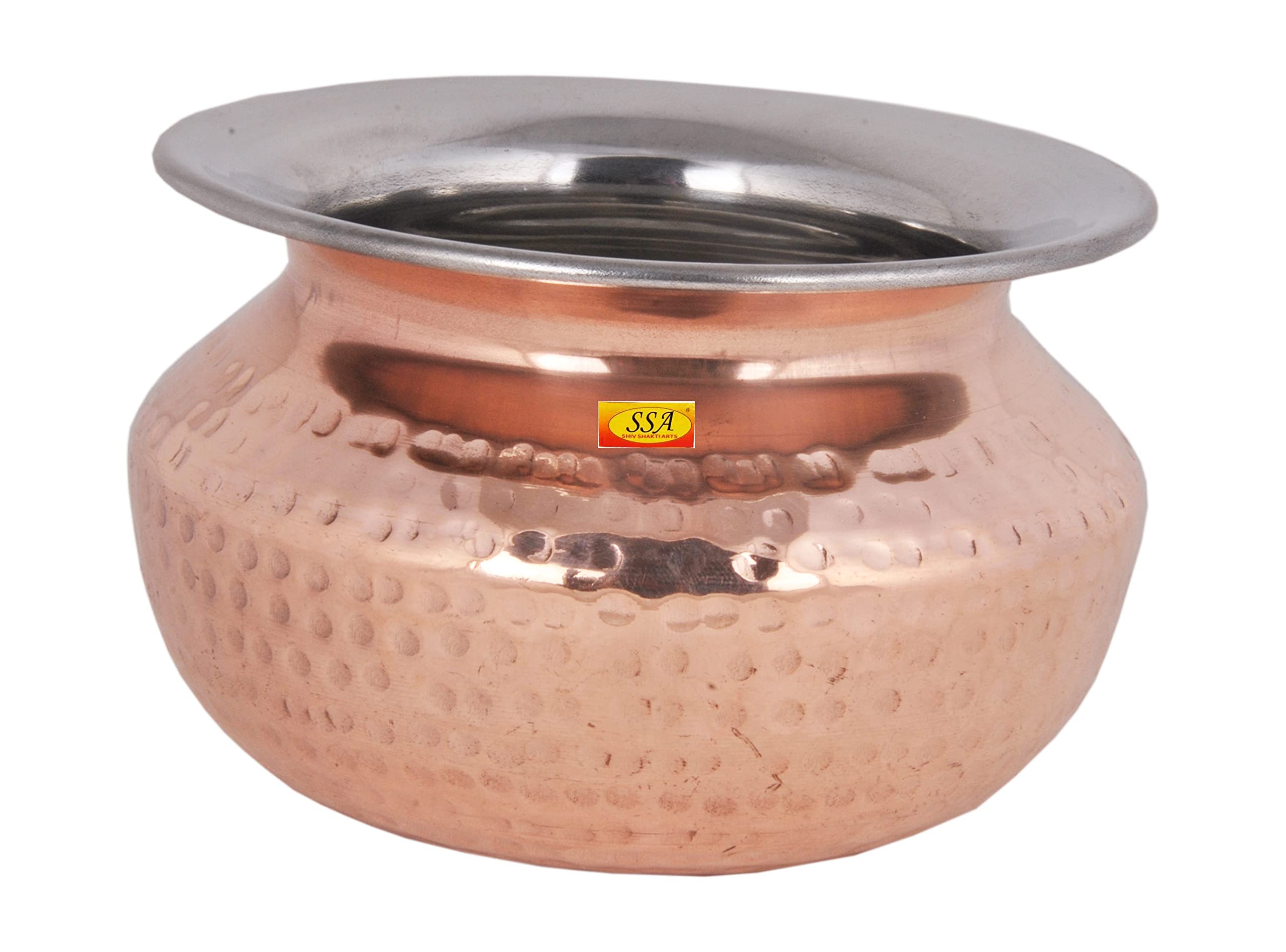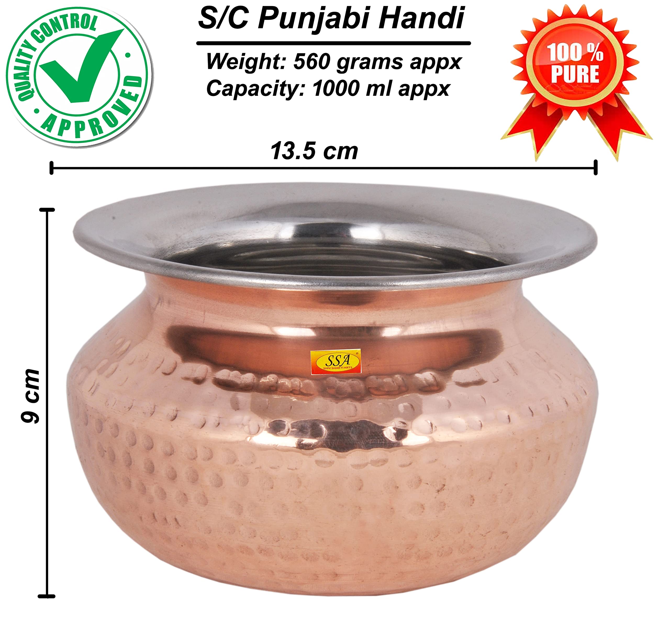 • Highly Durable Steel Copper Punjabi & Rajasthani Serving Handi= Dimension : 9 x 13.5 cm (Height x Width) Capacity - 1000 ML Weight - 560 Gram Approx = Diameter Of Top - 13.5 cm.