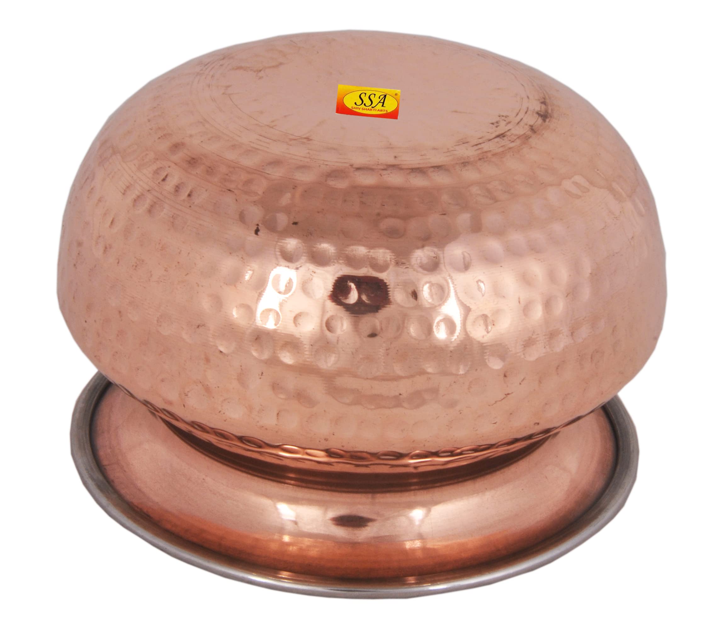 Relish Indian cuisine in Indian style! This is a set of centerpiece serve-ware for Indian food. Serve Indian dishes to your friends and family in this unique and ethnic looking centerpiece serve ware. With this serving utensil set your Indian style dining experience goes several notches up. The material used is food grade. Hammered Copper is used only on the outside of the utensil and does not come in contact with the food. Only the high quality food grade stainless steel is in contact with the food. Two layers of metal with air cushion ensure that the food stays warm much longer. Serving dinner in this dinnerware handi would be unforgettable experience. Care Tips a) Clean your copperware by hand and avoid dishwasher as the detergent can cause oxidation leading to permanent damage. b) Use a solution of equal quantities vinegar or lemon juice and salt diluted with some water at such times but don't use it regularly. c) Avoid scratchy cleaners like steel wool. d) A simple soft cleaning liquid on soap base hot water and a soft washing cloth is best for daily use. e) Use Copper Shining Powder for cleaning the copper utensils. Completely safe and gentle on hands. f) Copper Utensils Tarnish from time to time. This is Normal for an Authentic Copper utensils.