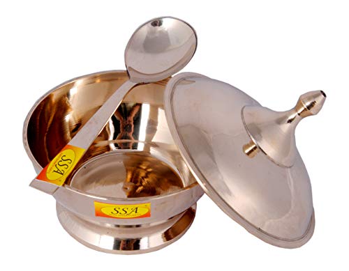 • Highly Durable Pure Bronze/Kansa handi/Donga Casserole With Spoon = Dimension : 16 x 15.8 cm (Height x Width) Debth - 5.7 cm Volume - 700 ML Weight - 1004 Gm Approx :: Serving Spoon = Dimension : 20.5 x 5.3 cm (Height x Width) Weight - 90 Gm Approx.