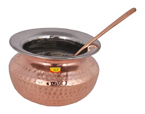 • Highly Durable Steel Copper Punjabi & Rajasthani Serving Handi With Serving Spoon = Dimension : 9 x 13.5 cm (Height x Width) Capacity - 1000 ML Weight - 560 Gram Approx = Diameter Of Top - 13.5 cm.|Spoon Weight- 57 gm Length-21.5 cm.