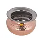 Relish Indian cuisine in Indian style! This is a set of centerpiece serve-ware for Indian food. Serve Indian dishes to your friends and family in this unique and ethnic looking centerpiece serve ware. With this serving utensil set your Indian style dining experience goes several notches up. The material used is food grade. Hammered Copper is used only on the outside of the utensil and does not come in contact with the food. Only the high quality food grade stainless steel is in contact with the food. Two layers of metal with air cushion ensure that the food stays warm much longer. Serving dinner in this dinnerware handi would be unforgettable experience. Care Tips a) Clean your copperware by hand and avoid dishwasher as the detergent can cause oxidation leading to permanent damage. b) Use a solution of equal quantities vinegar or lemon juice and salt diluted with some water at such times but don't use it regularly. c) Avoid scratchy cleaners like steel wool. d) A simple soft cleaning liquid on soap base hot water and a soft washing cloth is best for daily use. e) Use Copper Shining Powder for cleaning the copper utensils. Completely safe and gentle on hands. f) Copper Utensils Tarnish from time to time. This is Normal for an Authentic Copper utensils.