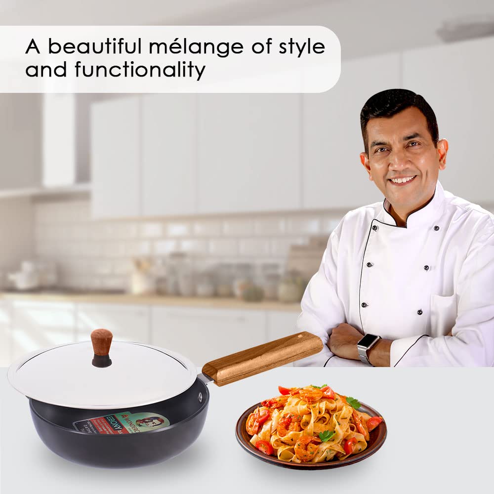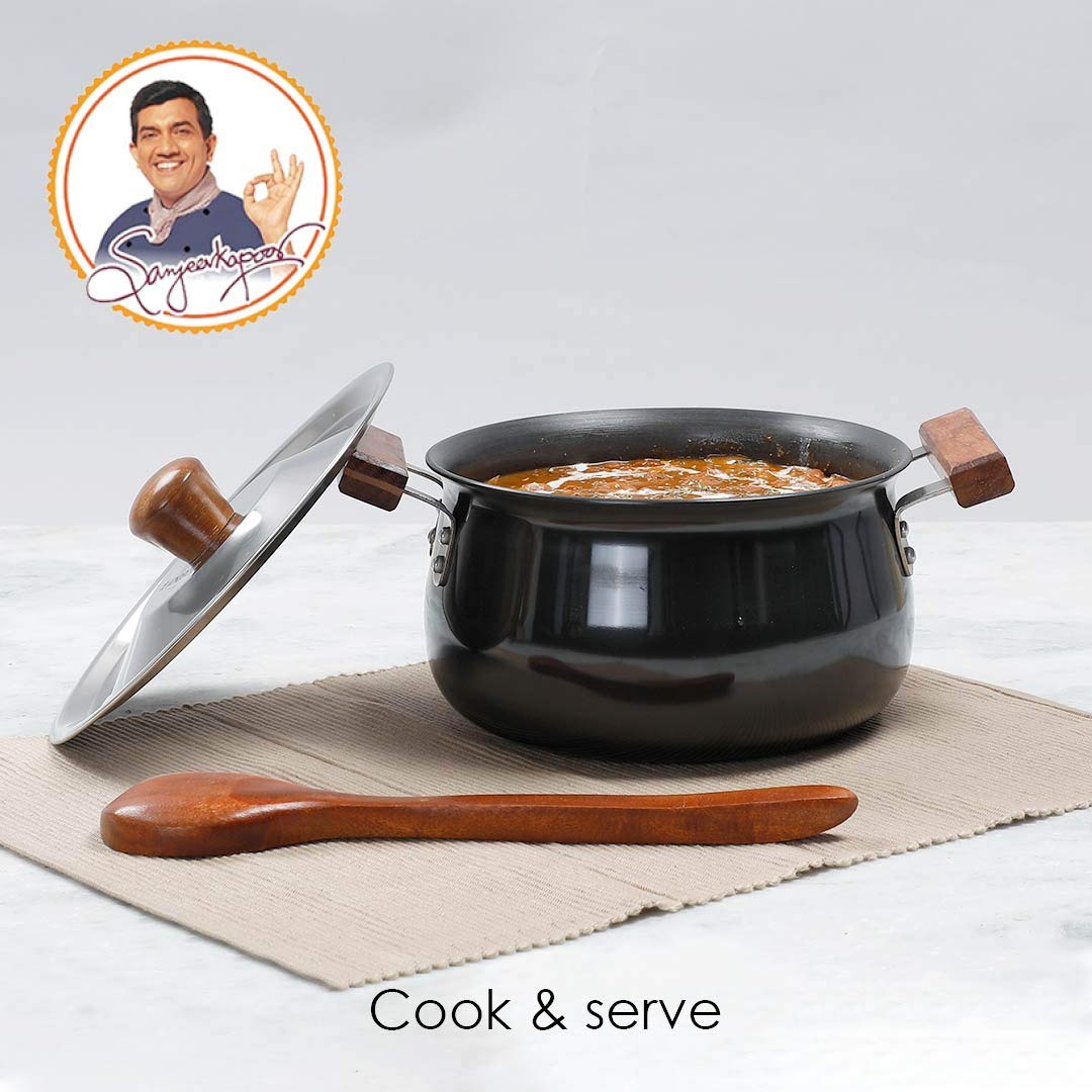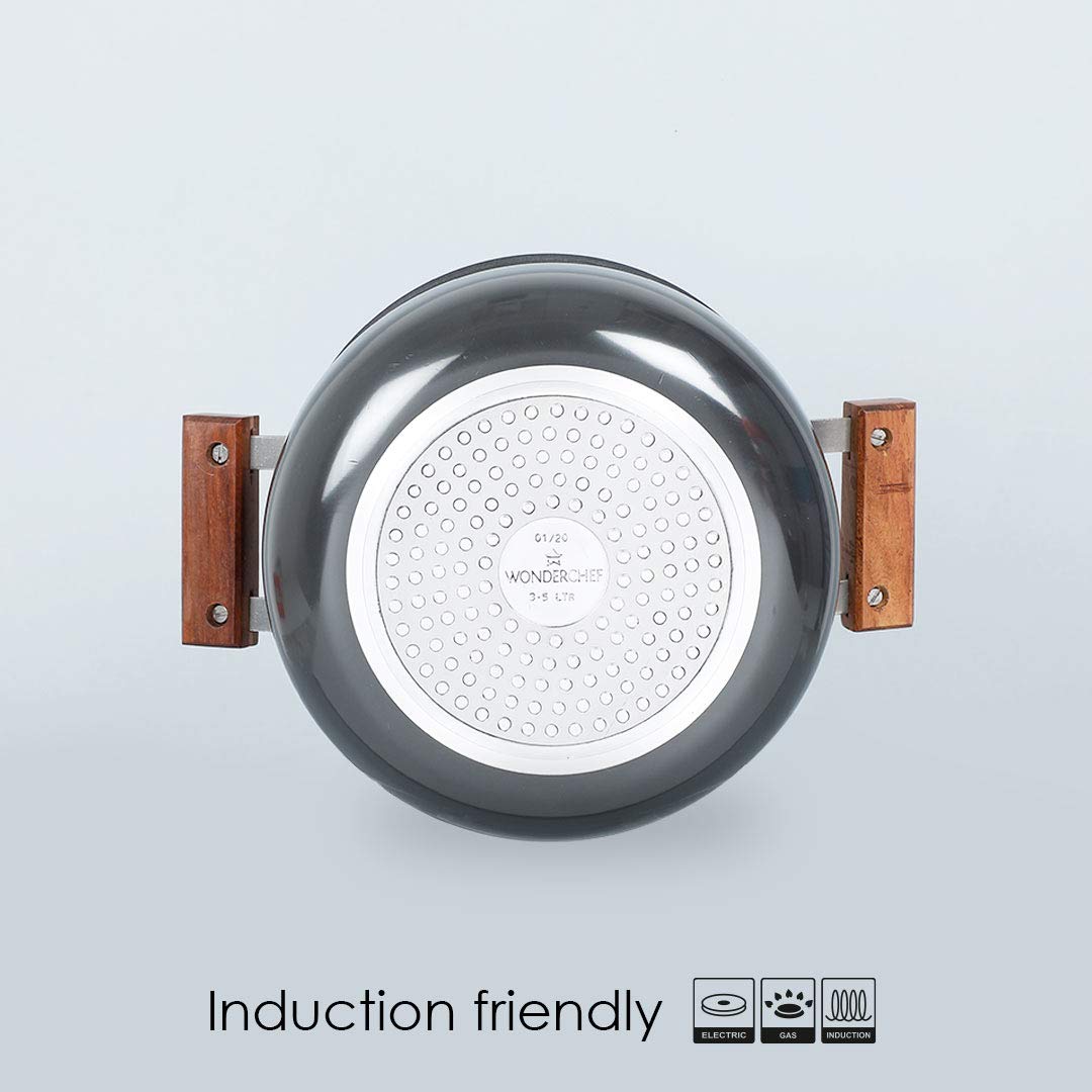 Wonderchef Ebony Handi 21 cm Replicate the experience of traditional Indian cooking pots in modern day cookware. The handi is designed specially to retain flavours in the food. Flat base outward curved sides which s at the neck for better heat distribution and retention. The pan surface is hard non-reactive and metal spoon friendly.Pure Aluminum body Made of virgin aluminium using cutting edge technology. 99.9% pure aluminium is a very good conductor of heat enables faster cooking saves energy and time. It never deforms allowing years of healthy cooking. Anodized coatingThe process of anodization makes the wok 2.4 times harder than steel. The non-toxic surface of the pan isstain and corrosion resistant maintaining its elegance after every use.