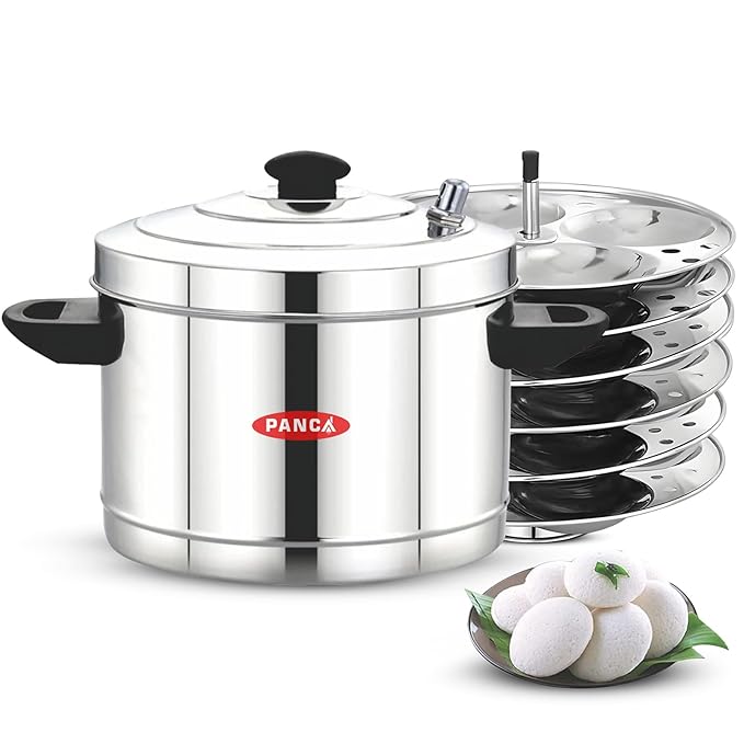 PANCA Idli Maker 6 Plates Stainless Steel 24 Idli Cooker | Induction & Gas Compatible Idly Steamer Pot | South Indian Idli Kadai with Dhokla Patra Steamer, Sambhar Chutni Wada Maker 15L Silver