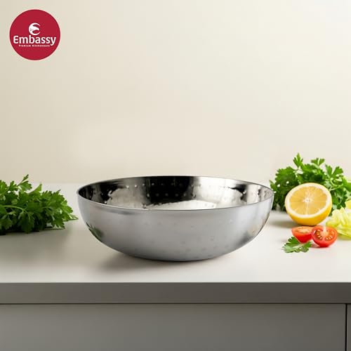 Embassy hammered tasla / kadhai (without handle) has been crafted from the stainless steel. It comes with an attractive hammered design which gives it an look and appeal. Available in 8 sizes: size 6 (325 ml) size 7 (600 ml) size 8 (700 ml) size 10 (1 500 ml) size 12 (2 500 ml) size 14 (3 500 ml) size 16 (5 000 ml) and size 18 (6500 ml).
