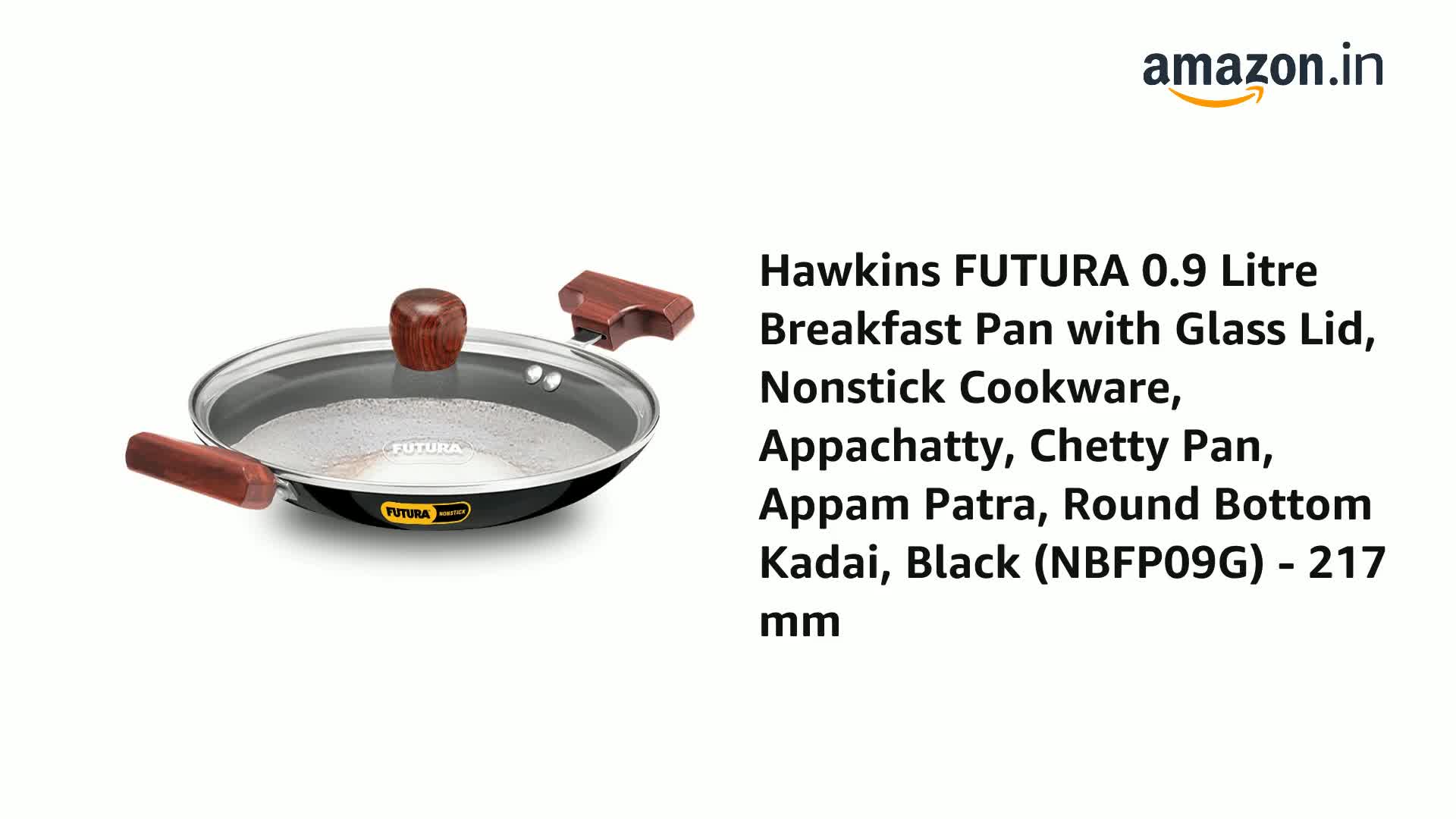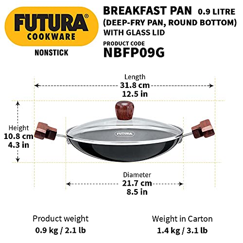 FUTURA Hawkins 0.9 Litre Breakfast Pan with Glass Lid, Nonstick Cookware, Appachatty, Chetty Pan, Appam Patra, Round Bottom Kadai, Black (NBFP09G) - 217 mm