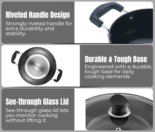 Vinod Hard Anodized Cookware is designed with thick body which helps even heat distribution and makes the cookware long lasting and durable. Itâs new improved coating makes the cookware durable and poses no harm to food. The beautiful durable black finish which is hard anodised has two benefits i.e. it makes the cookware absorb heat faster making it more energy efficient and the cookware stays looking the same for years. This cookware has sturdy riveted handles for better grip and it comes with tempered glass lid which allows you to see through the cooking process. This is both gas stove and induction compatible.
