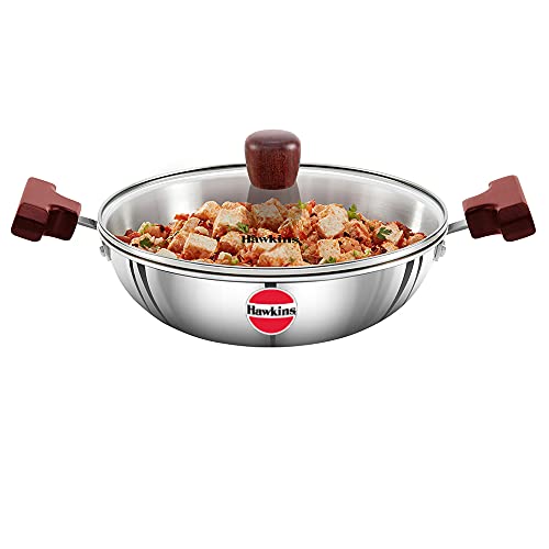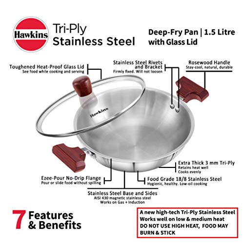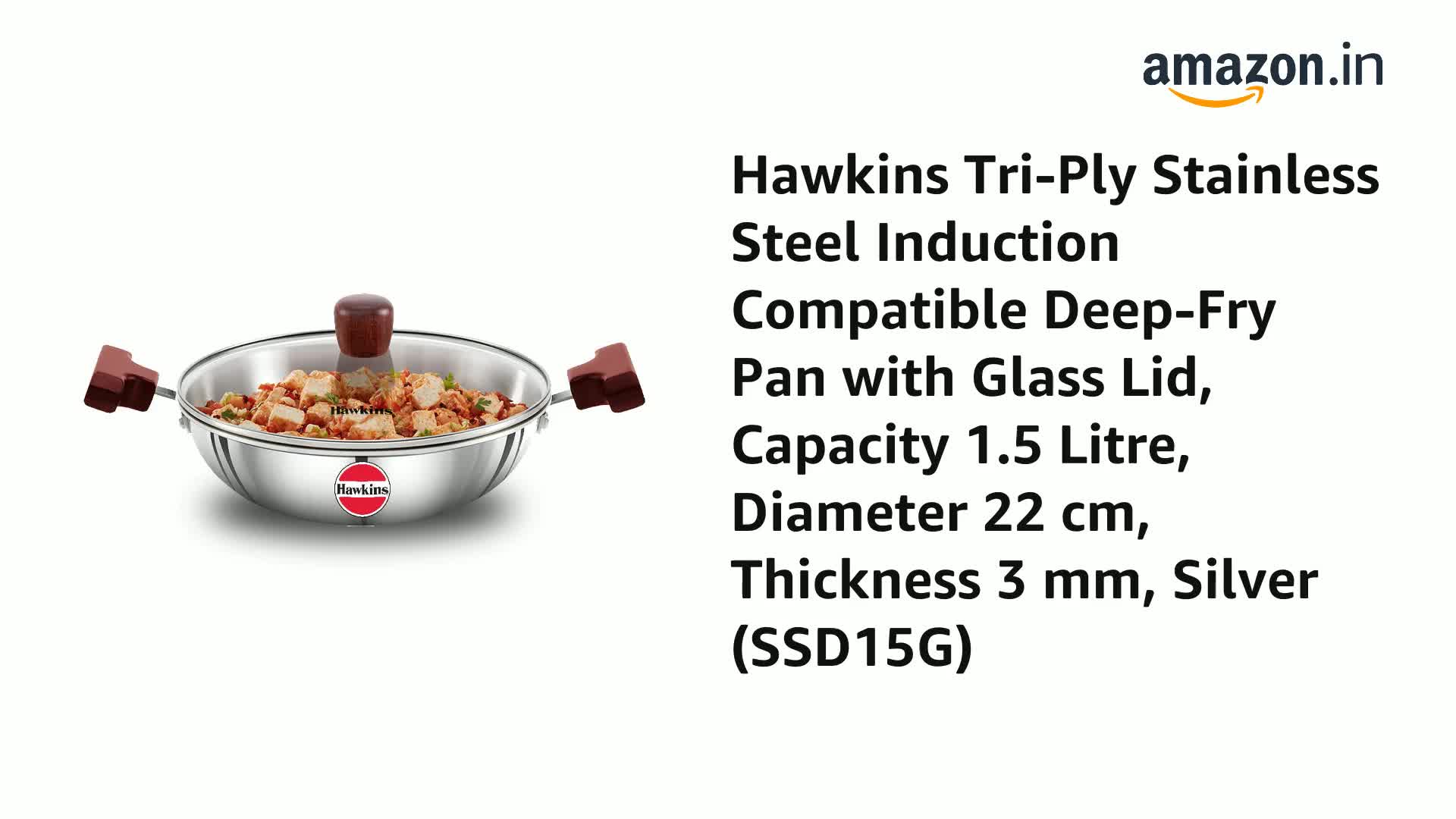 Hawkins Tri-ply Stainless Steel Deep-Fry Pan is designed to give you all the advantages of cooking in stainless steel while minimizing the disadvantages of sticking and burning that are normally associated with ordinary stainless steel. The cooking surface (inner surface) is made from 18/8 food-grade (AISI 304) stainless steel which is extremely hygienic most durable does not react with most foods and does not pit or corrode. The heavy gauge aluminium core spreads heat well for even cooking with no hot spots and retains heat for quick cooking. It is sandwiched between two layers of stainless steel and does not come in contact with food on the cooking surface. The base (outer surface) is made of AISI 430 grade magnetic stainless steel. Hence this cookware can be used on all domestic gas induction electric ceramic and halogen cooktops. The rounded curved sides and extra height are most suitable for deep-frying Puri Samosa Wada and stir-frying Stews Curries and vegetables. The rim of the pan has an all around ezee-pour no-drip flange - specially designed to pour or slide foods without spilling - suitable for left or right handed use. The toughened thick Glass Lid is made of heat-resistant glass with a strong stainless steel rim and stay-cool knob. It stops splatter of hot foods.
