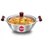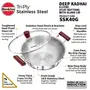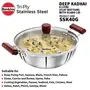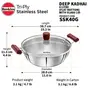 Hawkins Tri-ply Stainless Steel Deep Kadhai is designed to give you all the advantages of cooking in stainless steel while minimizing the disadvantages of sticking and burning that are normally associated with ordinary stainless steel. The cooking surface (inner surface) is made from 18/8 food-grade (AISI 304) stainless steel which is extremely hygienic most durable does not react with most foods and does not pit or corrode. The heavy gauge aluminium core spreads heat well for even cooking with no hot spots and retains heat for quick cooking. It is sandwiched between two layers of stainless steel and does not come in contact with food on the cooking surface. The base (outer surface) is made of AISI 430 grade magnetic stainless steel. Hence this cookware can be used on all domestic gas induction electric ceramic and halogen cooktops. You can stir without spilling and carry hot curries safely to the table due to its deep body. The rounded curved sides and extra height are most suitable for deep-frying Puri Samosa Wada and stir-frying Stews Curries and vegetables. The rim of the pan has an all around ezee-pour no-drip flange - specially designed to pour or slide foods without spilling - suitable for left or right handed use. The toughened thick Glass Lid is made of heat-resistant glass with a strong stainless steel rim and stay-cool knob. It stops splatter of hot foods.