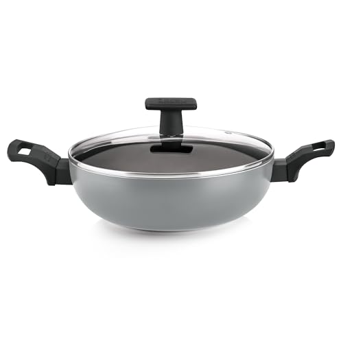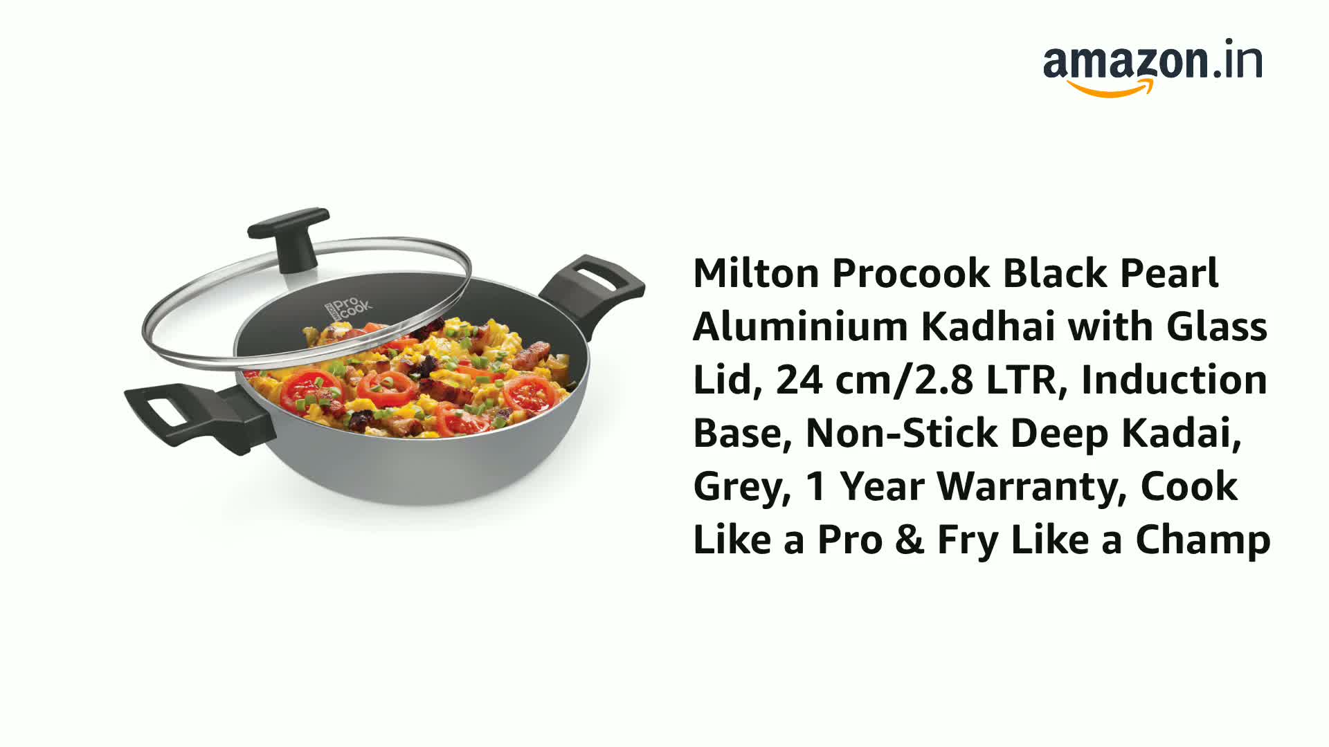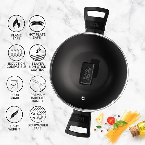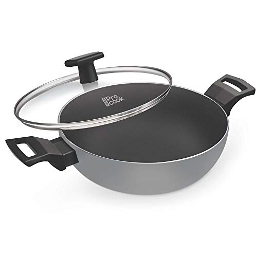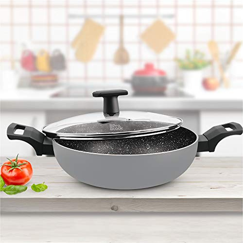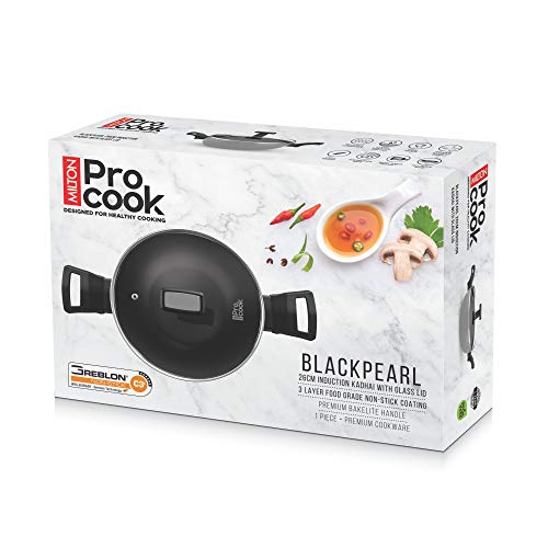 Black Pearl is a 3 layer Food Grade Non-stick coating Kadhai with glass Lid. It is Scratch Resistant wear-resistant with high hardness enhances both durability and cooking performance perfect to use for high heat with minimum oil or buttercream for those into a healthy diet. Designed for induction microwave gas hot plate. Borosilicate glass is used for its Lid which withstand temperature up to 300 degree Celsius. Handling and maintenance are easy with its premium Bakelite handle. (Bakelite is poor conductor of heat so would not burn even when exposed to high heat).Black Pearl Kadhai is dishwasher safe its smart non-stick surface saves a lot on clean-up time. Kadhai with glass lid helps to Keeps heat within which helps to cook food faster. This Fry Pan is perfect for any type of cookware collection. It is an ideal for everyday cooking for several types of meals like pulaos biryanis layered baked dishes etc. It is PTFE PFOA free.