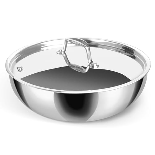 this has best of both the qualities of aluminium and steel kadhai- When we make poha the poha sticks to the bottom as it would do in a heavy aluminum kadhai, and the upside is since it is steel we do not have to transfer it to another vessel, cleaning is very easy and the food cooks evenly good value for money. posting after 2 weeks of use.