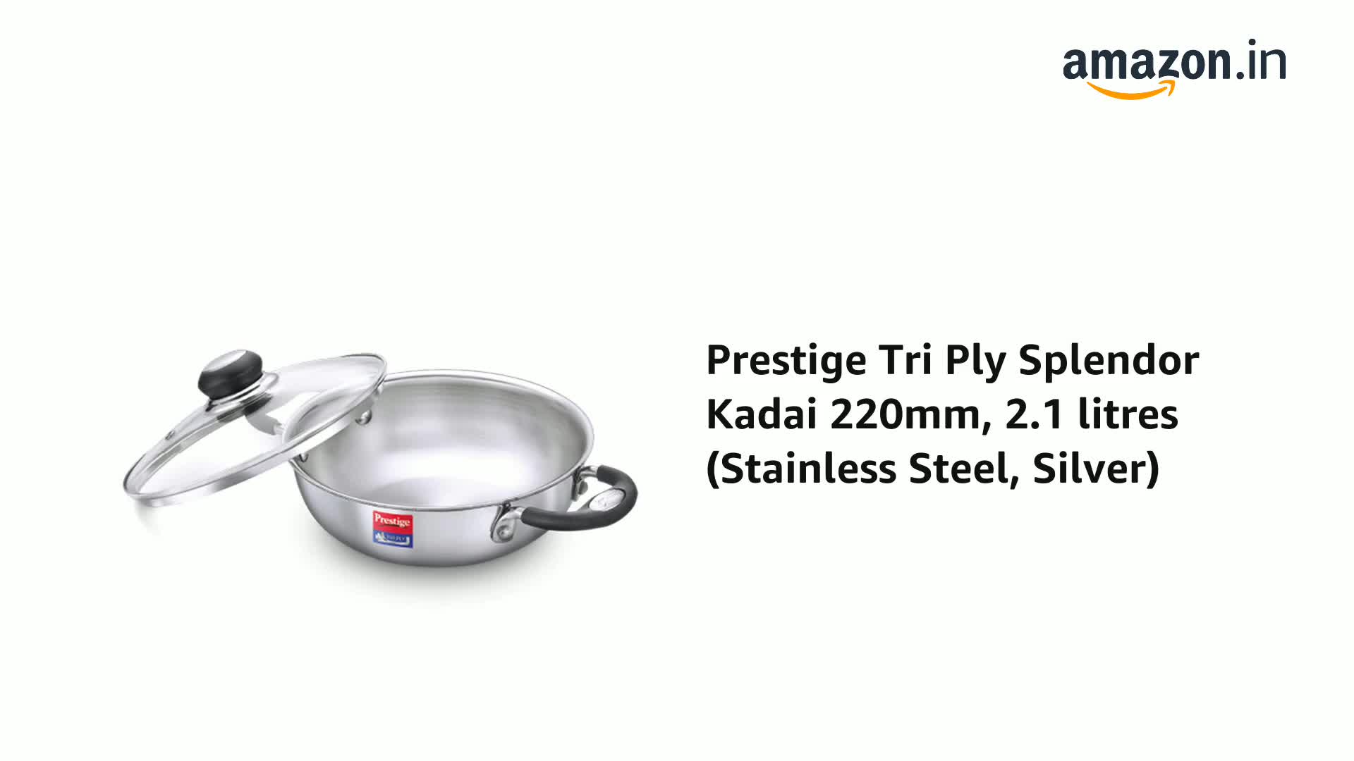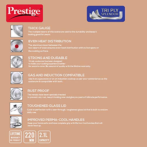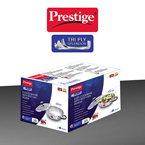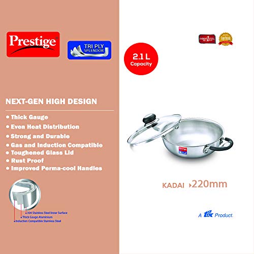 Prestige 22cm/2.1L Tri-Ply Stainless Steel Splendor Kadai with Lid| Gas & Induction Compatible| Even Heat Distribution| Strong and Durable| Perma-Cool Handles