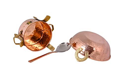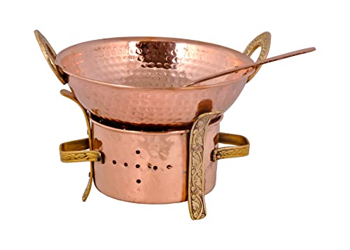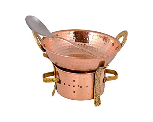 Shiv Shakti Arts® Pure Copper Kadhai with Spoon & Angithi/Sigdi with Brass Stand for Home Hotel & Restaurant Tableware Serveware Dishware 3 Piece Set