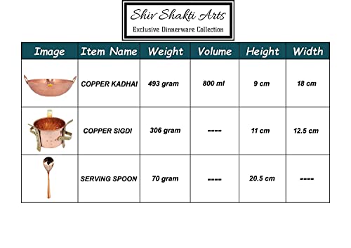 • Highly Durable Pure Copper 3 Piece Set Dimensions => Sigdi =: Height - 11 Cm Length - 11 Cm Width - 12.5 Cm Weight - 306 Gram | Kadhai => Diameter - 18 Cm Height - 9 Cm Capacity: 800 Ml Weight - 375 Grams. Spoon - Approx Length - 20.5 Cm Weight - 70 Grams