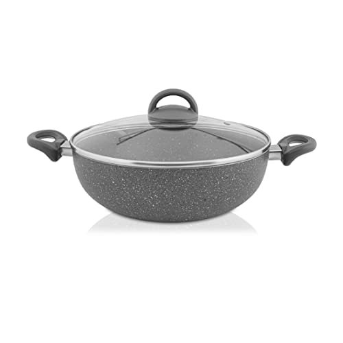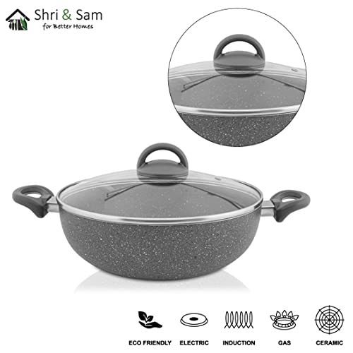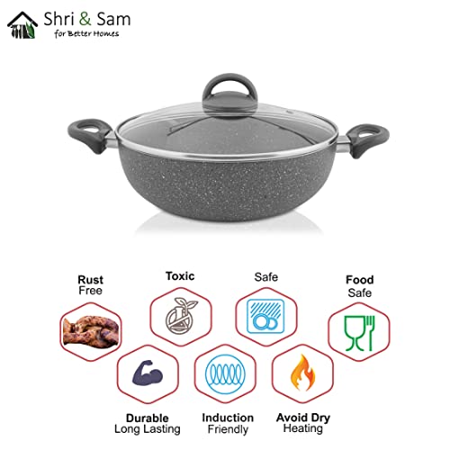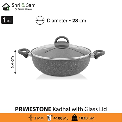 This Primestone Deep Kadhai with Glass Lid by Shri and Sam is built in heavy gauge aluminum that has non stick coating. Comes with a soft touch handle that smoothens the grip on your hand while lifting it. This Primestone Deep Kadhai with Glass Lid is easy to maintain and takes less space in your kitchen. This product has an induction bottom which means that it is compatible to all heating sources like gas electric induction etc.
