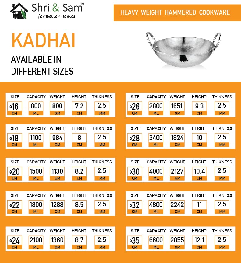 Maine 4.8 litre ki kadhai mangai bahut achchi recieve hui. Bahut heavy hai bottom ki thickness owsome hai jisse khana jalta nahi befikra hoker buy kare. Mai bahut khush hu.