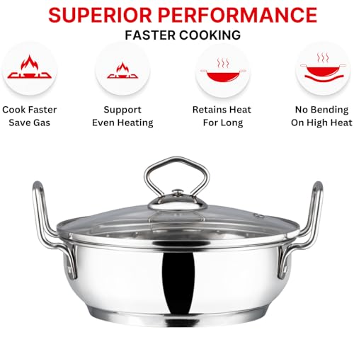 Fry your favourite fries or prepare your meat. Boil your vegetables or cook your sauce. This multi purpose induction friendly kadai is a must have in your kitchen. Comes with a tempered glass lid. Now cook and serve in it too.
