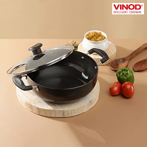 HomeKitchenTraditional CookwareKadhaiVinod Cookware Deep Kadhai with Glass Lid Hard Anodized Pot Riveted Handles 5.5 Liters(5.8 Quarts) 28cm Multi-Use Wok Suitable For Indian Cooking, Sauces, Pasta, Stews, Soups Round Bottom