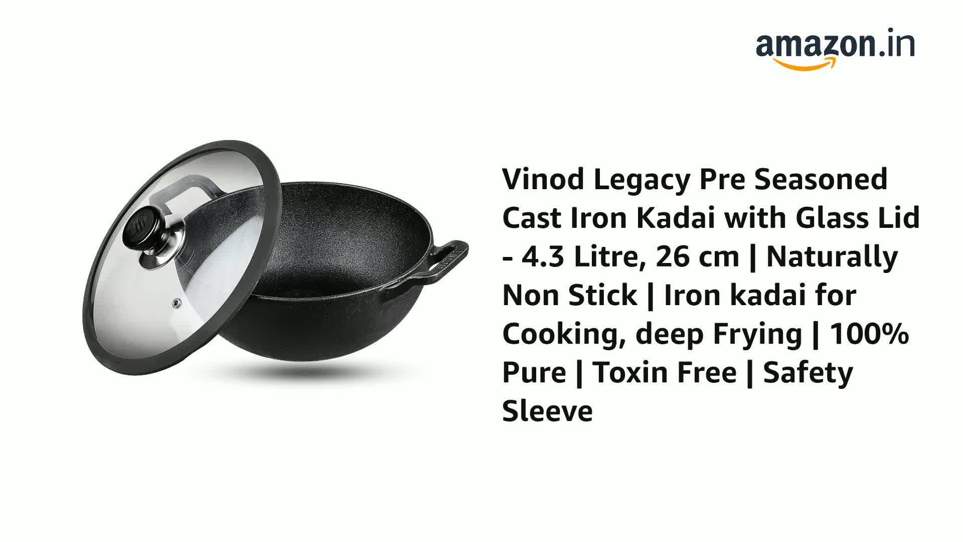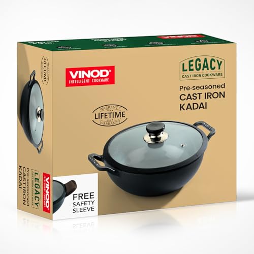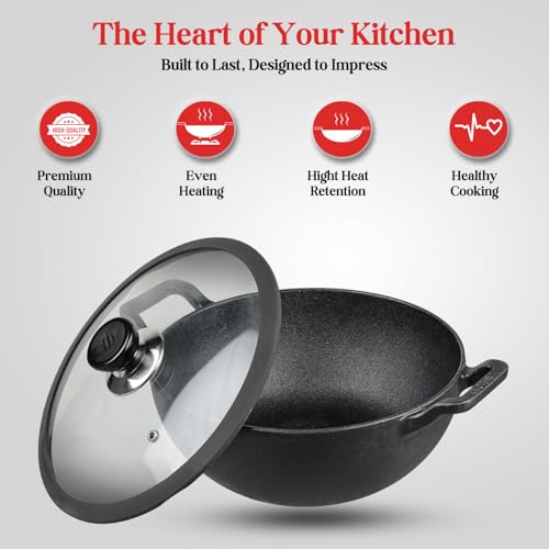 Vinod Legacy Pre-Seasoned Cast Iron Kadai with Lid 4.3 L Capacity (26 cm Diameter) - Induction and Gas Stove Friendly Black