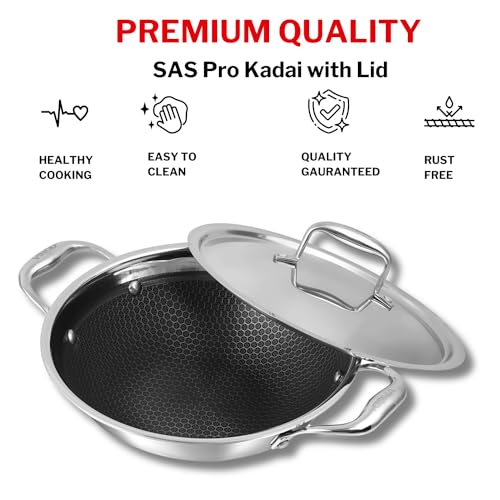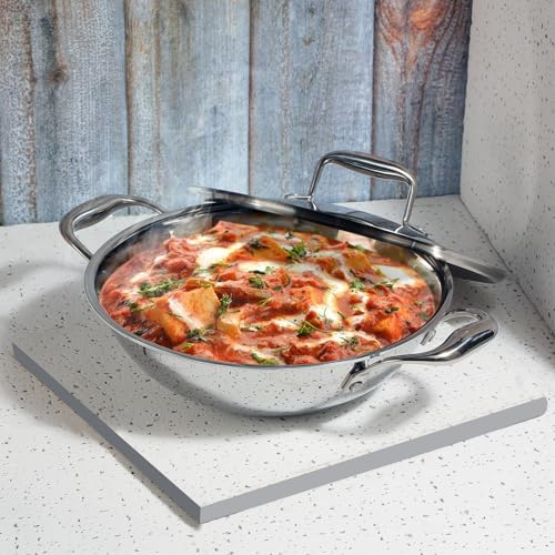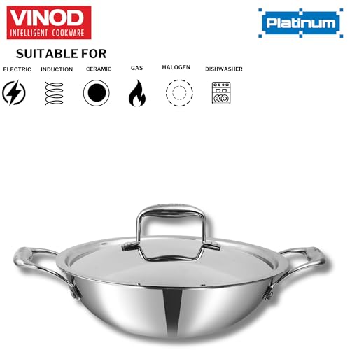 Vinod Platinum Triply Stainless Steel Kadai with Lid: Diameter- 22 cm, Capacity 1.8 Liter (1.9 Quarts)