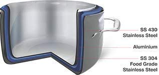 LAYER 1-Food Grade 18/8 stainless steel used in the inner surface for healthy cooking. 18/8 stainless steel is the most superior stainless steel with the longest life.