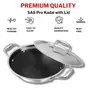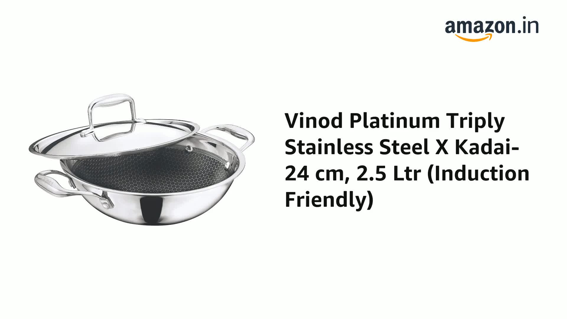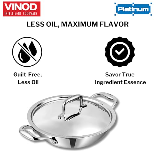 Vinod Platinum Triply Stainless Steel X Kadai with Lid - 2.5 litres Capacity 24cm Diameter with Riveted Sturdy Handle (Induction and Gas Stove Compatible) - Silver