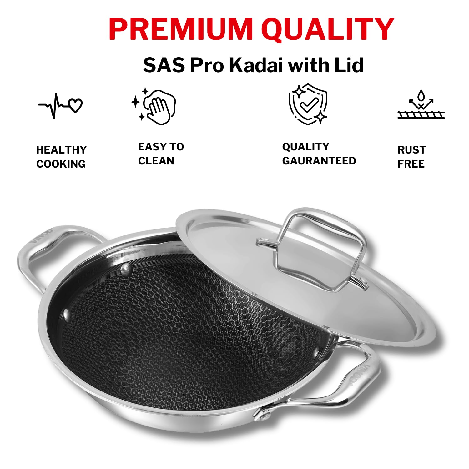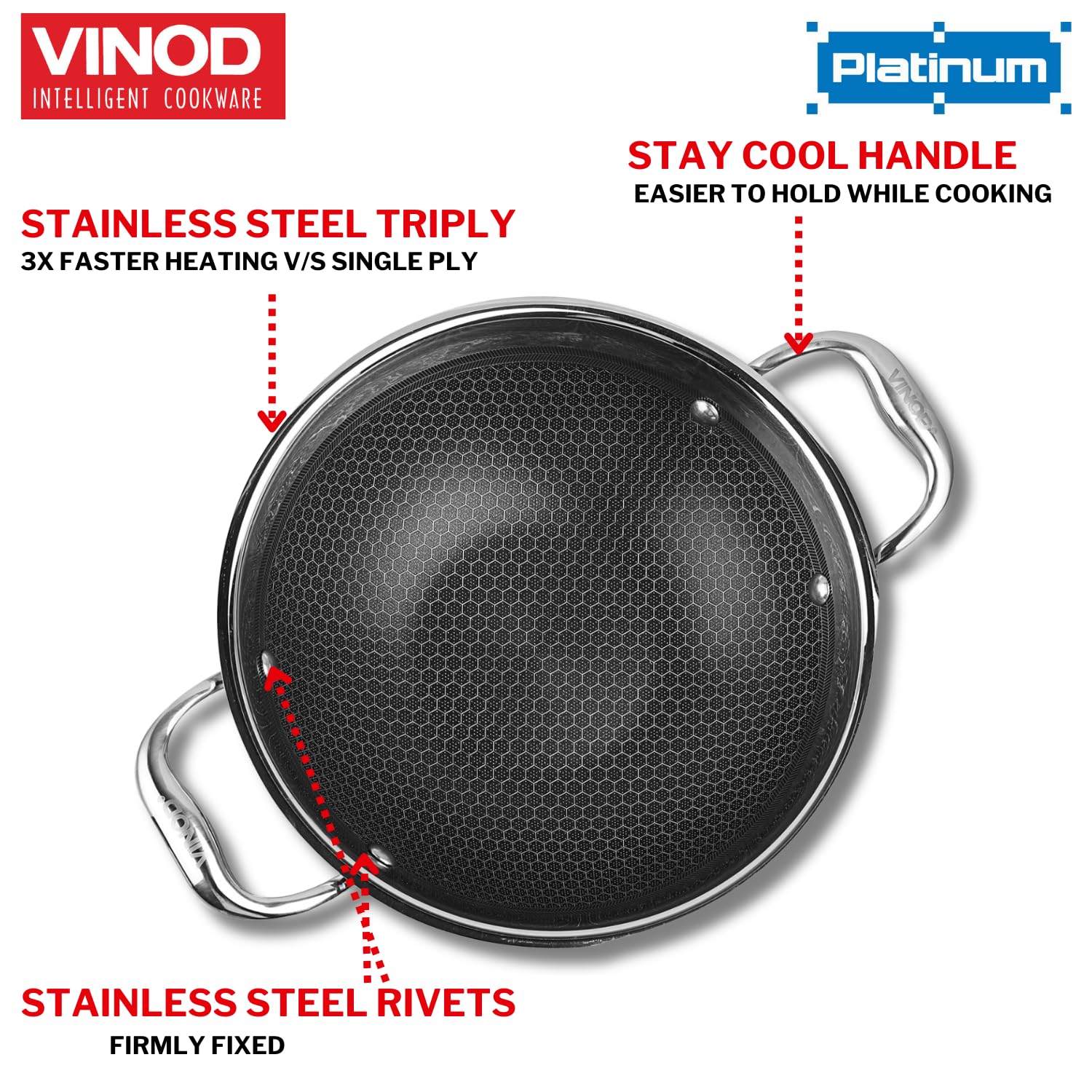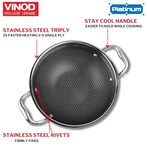 Vinod SAS Pro Platinum Triply Stainless Steel Non Stick Kadhai with Lid - 2.5 Litre, 24 cm | Ceramic Coating | Honeycomb Design Induction Base - 5 Year Warranty