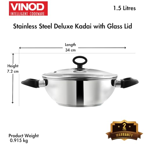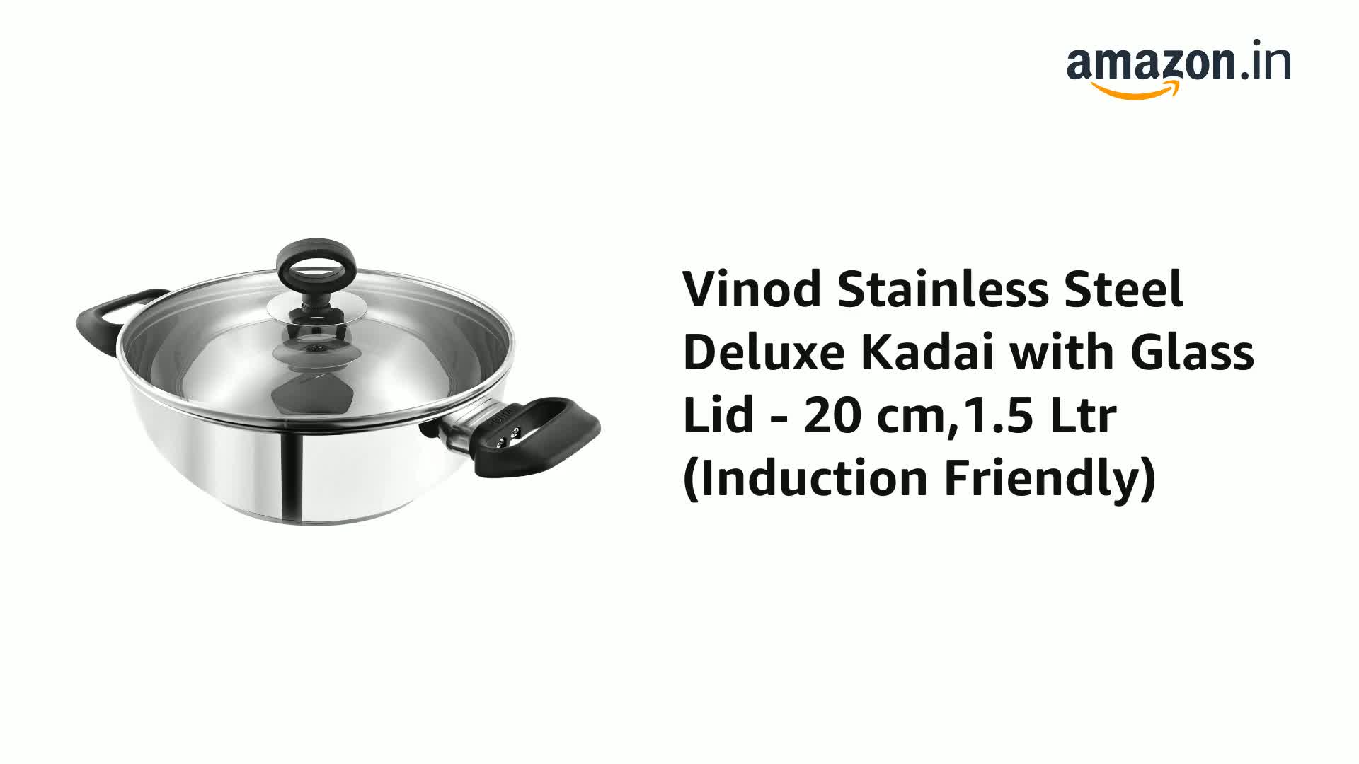 HomeKitchenTraditional CookwareKadhaiVinod Stainless Steel Deluxe Kadai with Glass Lid with Riveted Handles- Diameter 20 cm Capacity 1.5 Litre (Induction and Stove Friendly) 2 Years Warranty Silver