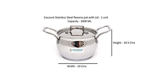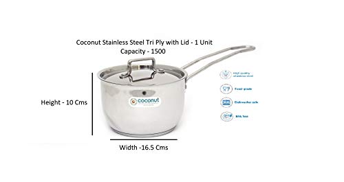 Coconut is a range of Innovative and products for Home and Kitchen Utilities. Triply Sauce Pan is made with base that has blend of three metals that is quite strong and it is great addition to your kitchen cuboards.This pan makes it easy to cook food faster and evenly. The product is made from stainless steel hence has a strong build. The bottom sandwich steel makes it more durable. The handle doesn€™t shake or loosen because it is riveted in place. It is non-corrosive surface makes it free from rust. The bottom of the vessel is made with triply making it stronger and helps it to cook food faster and evenly due to which the food doesn€™t stick to the bottom and conserves fuel too. This is Gas & Induction Compactible . Product content : SS Sauce Pan(1500ML) & (Rexona (2000ML) - Set of 2 Quantity.Dimension Sauce pan 1000 - Width 16.5 Cms & Height 10 Cms Rexona 2000- Width - 19.5 Cms & Height - 10 Cms