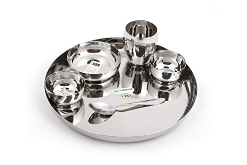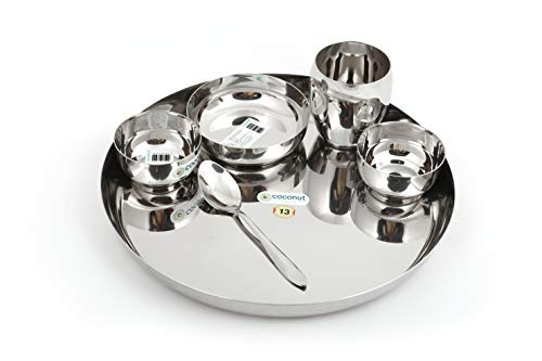 Coconut is a range of innovative and products for Home and Kitchen essentials. Coconut always keeps striving to provide you with the most Authentic products. It adds Something Unique To Your Dinnerware collections for your kitchen cupboards which comes with 6 Pieces of Dinner Set. These Dinner Sets are Crafted from Food Grade Finest Stainless Steel material. Rust Proof and Hygienic. It is very easy to Clean and Maintain. Dishwasher Safe & BPA free. Dinner Set can be used as Gifting options for your Relatives or Friends on Occasions like Marriage House Warming Ceremony and other events. Product Content : SS 6 Pieces Dinner Set - (P8 Size-12 - Full Dinner Plate Thali - 1 Qty - Dimension - 10 Inches ) (B1- Honda Glass(200 Approx) - 1 - Qty) ( C3 Bowls-Size -4.5 - 2 Qty- Dimension- 3.4 Inches) (H9 Desire Plate - Size - 5.5 - 1 Qty-Dimension -4.2 Inches) & (Master Spoons -1 Qty)