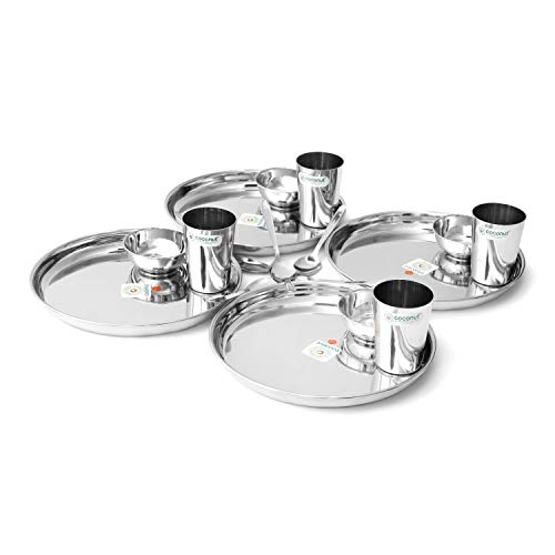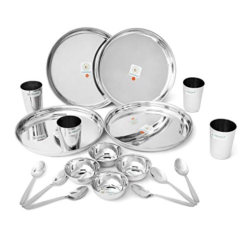 Coconut is a Range of Innovative and products for Home and Kitchen. These Dinner Sets are crafted from Food Grade Stainless Steel material. Rust Proof and Hygienic. It is very easy to clean and maintain. Dishwasher Safe & BPA free. This Dinner set is ideally used for everyday usage and it is also used as Gifting options for your Relatives or Friends on the Occasions like Marriage House warming Ceremony and other events. Product Content : Coconut Stainless Steel Compact Dinner Set 18 Pieces Set (Beeding plate Thali 10€ €“ Size 12 €“ 4 Pieces) (Amitabh Water Glass €“ 4 Pieces) ( Mukta Vati C9 Size 5 €“ 4 Pieces) & ( R3 Baby Spoon €“ 6 Piece.