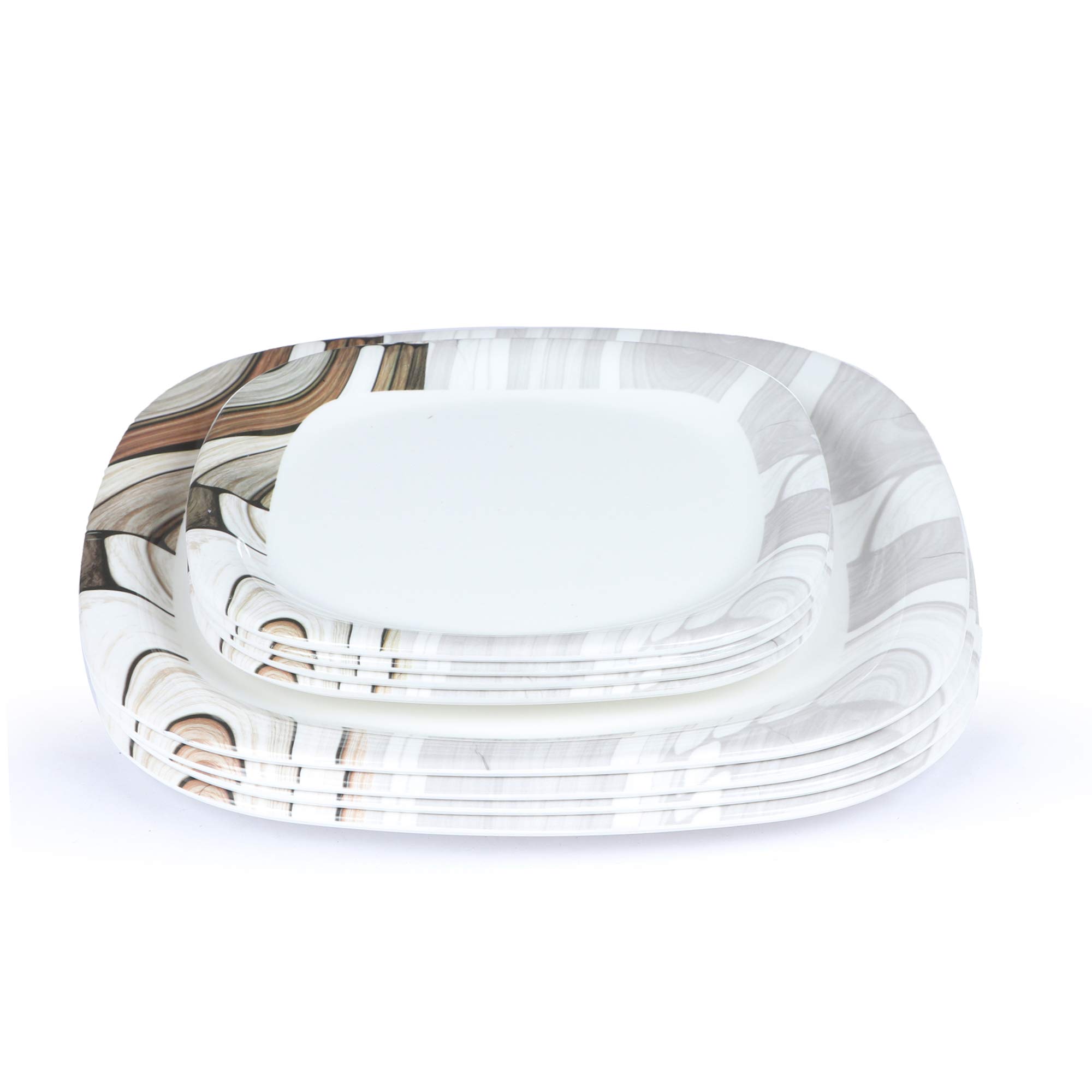 • Package Content:- Pack of 4 Full Plates Size:- 11 Inches , Pack of 4 Quarter Plates Size:- 7 Inches , Pack of 4 Veg. Bowl , Stain Resistant 3 Layered Laminated Glass Freezer Safe