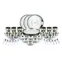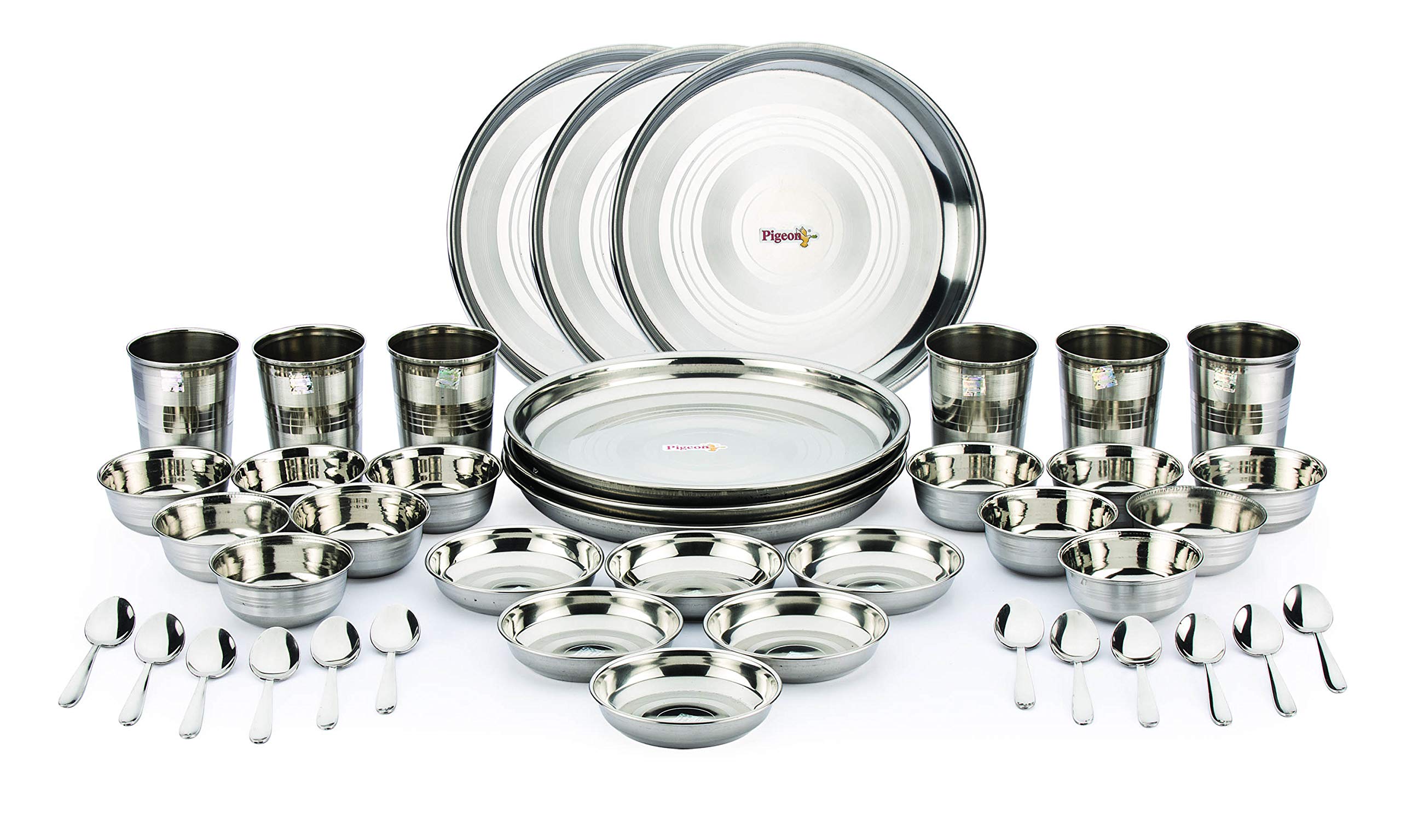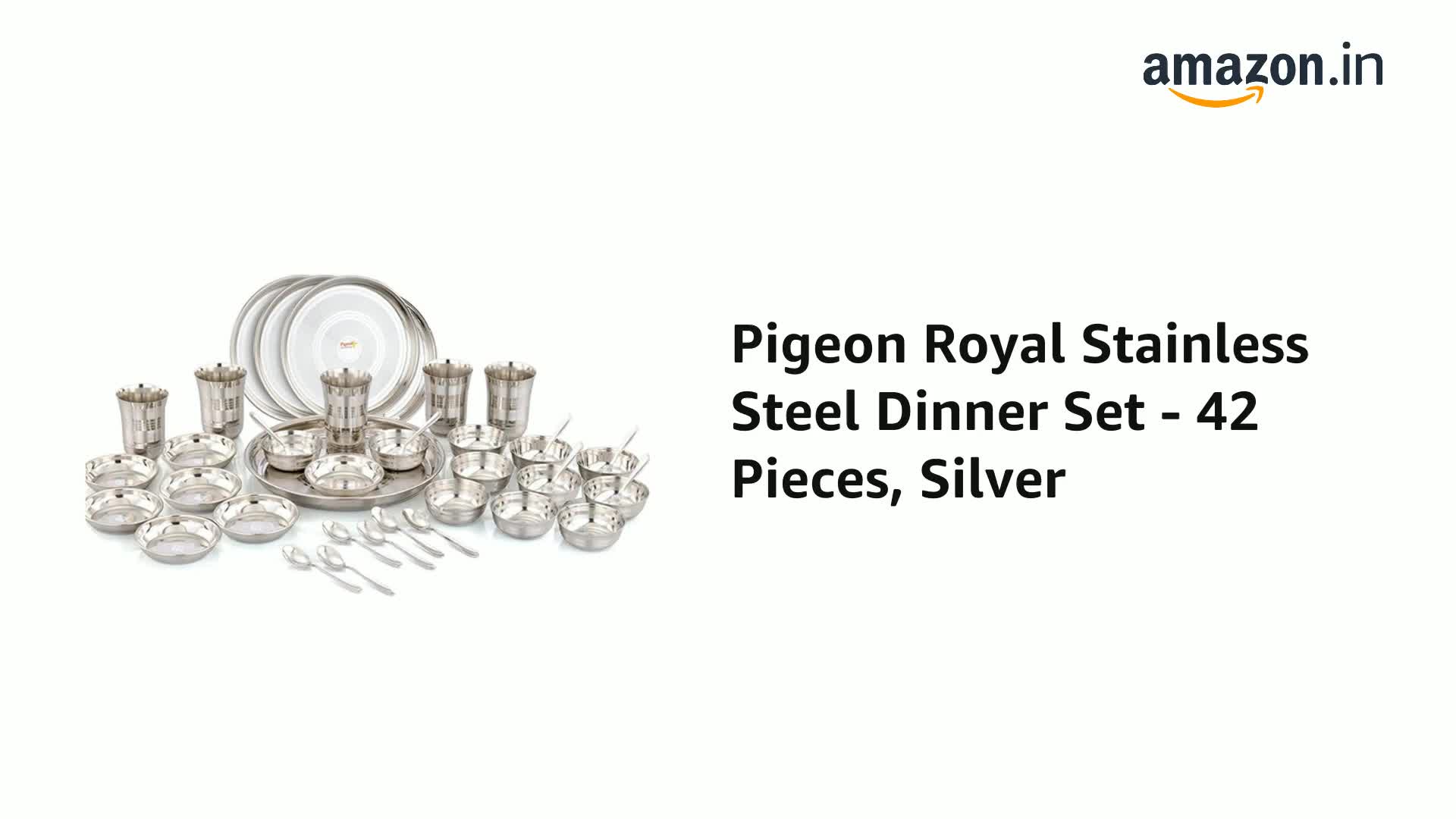 Featuring a set of 42 stainless steel lunch tableware including thalis katoris drinking glasses small plates and teaspoons the Pigeon lunch set is ideal serving a scrumptious meal for up to 6 people with ease. Featuring a highly attractive design motif this lunch set will surely impress your lunch and dinner guests while providing a great canvas to showcase your delicious food. Apart from your own use you can also give this lunch set to your loved ones as a perfect gifting option on special occasions or festivals. Made from thicker gauge stainless steel the 42-piece Pigeon lunch set is highly durable and can withstand the rigours of daily use with ease. Its strong and sturdy construction makes this set an ideal solution for both special occasions as well as everyday meals. Furthermore all plates spoons and bowls in this set are rust-proof and hygienic preventing contamination of your food. The individual pieces in this lunch set can be nested together and this makes them ideal to stack up and store away when not being used saving valuable kitchen space. Thanks to its sturdy construction you can easily clean this lunch set with a simple detergent solution and retain its shiny looks for a long time.