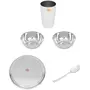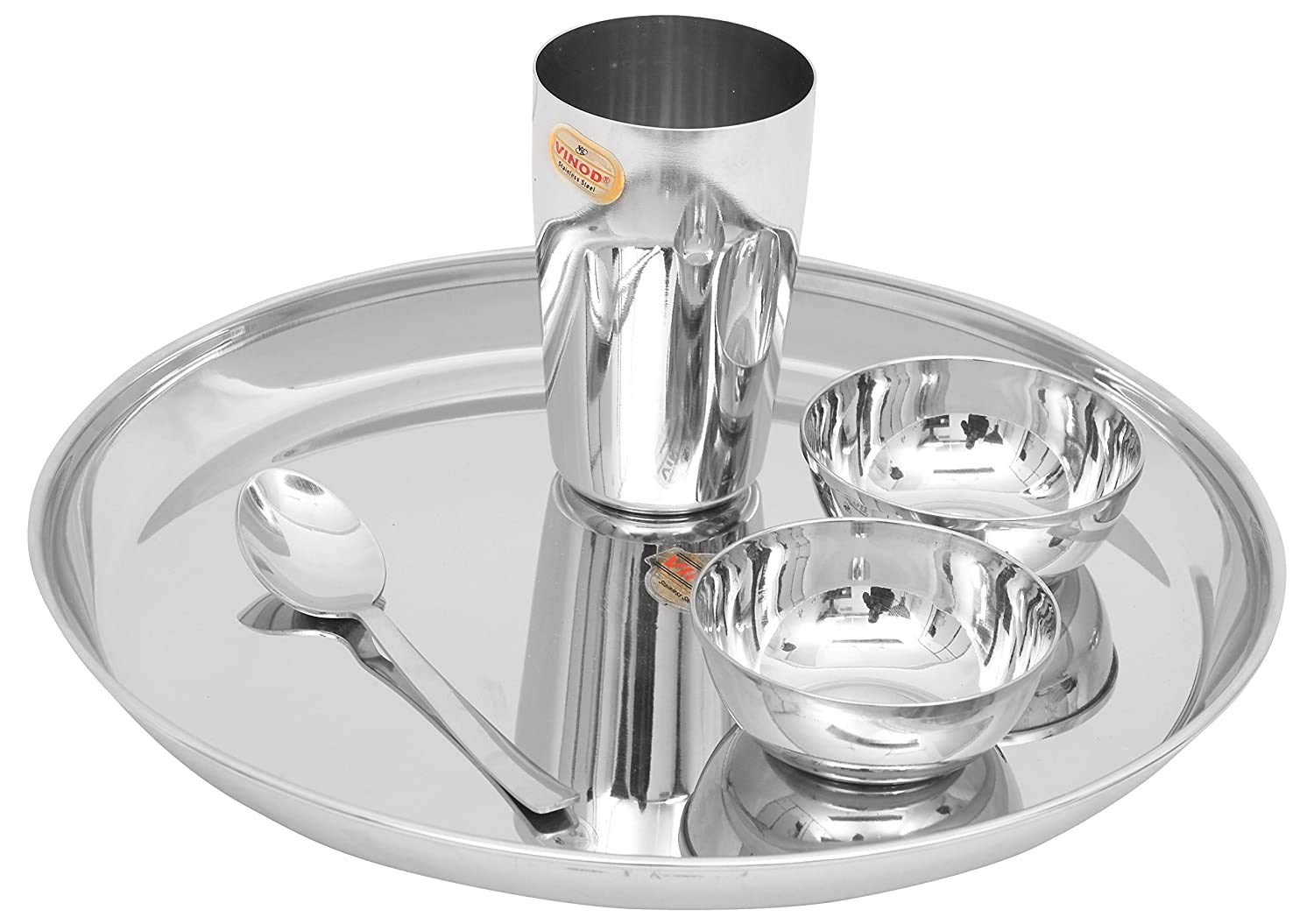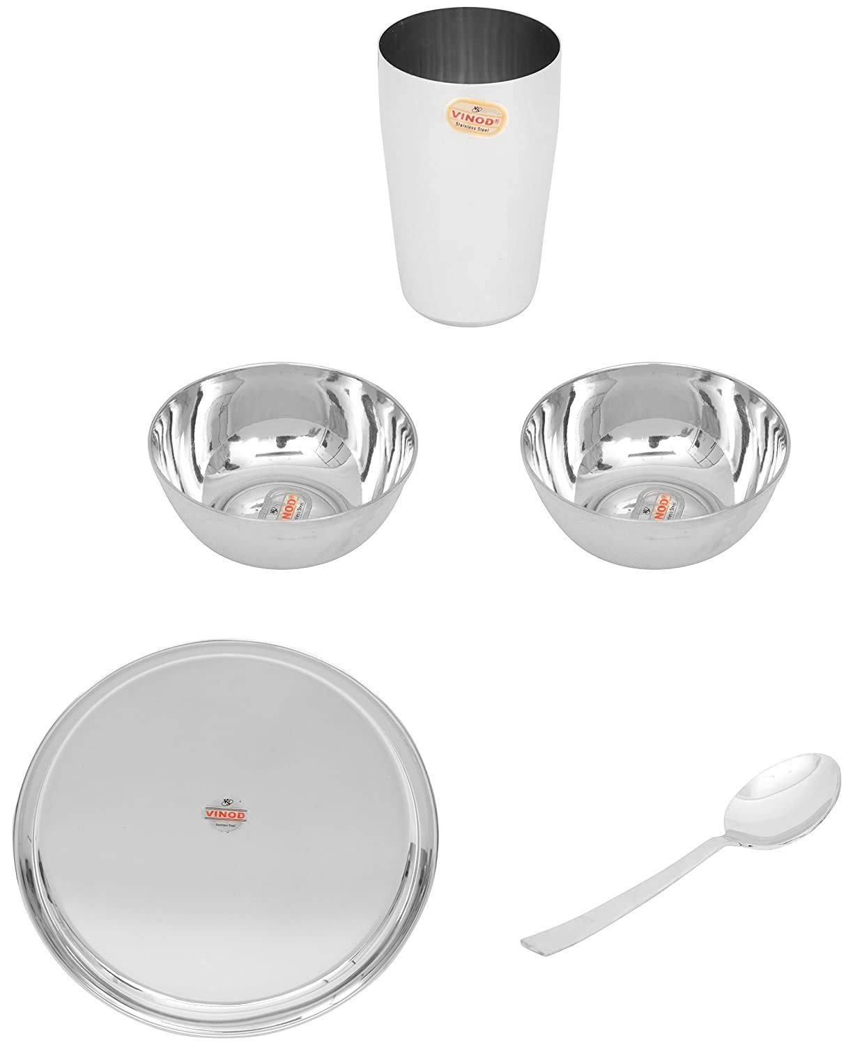 Vinod presents this silver color dinner set. It is made of stainless steel. This package contains 1 plate 2 bowls 1 glass and 1 spoon. It has seller warranty up to 1 years and the replacement warranty is available against manufacturing defects only.