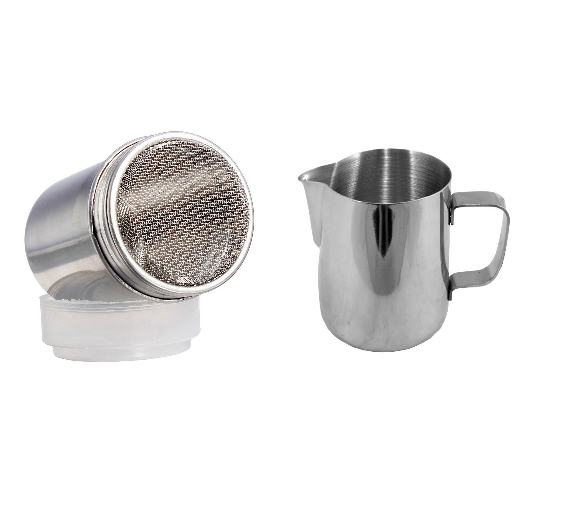 Perfect for one cup of coffee Beautiful stainless steel design Molded pouring spout and sturdy handle Milk-frothing pitcher for making cappuccinos and cafe lattes kitchen craft stainless steel jug, Stainless steel jugs ideal for serving milk and cream With a mirror polished exterior and brushed finish interior. Capacity: 600ml Material: Stainless steel, WITH STAINLESS STEEL Chocolate Shaker Duster Cocoa powder Sugar Coffee Cappuccino Latte Sifter + Lid, Ideal for shaking Icing onto cakes, chocolate onto cappucinno's or flour. Ideal for Making Hot Chocolate or Cappuccinno. This is a small shaker with Air tight plastic cover to keep the conents fresh.