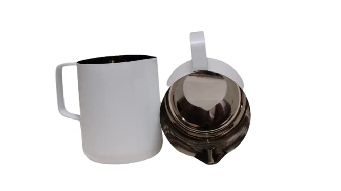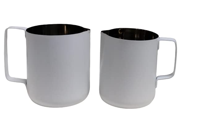 Quality stainless steel. Rust-proof stain-proof heat-proof and nontoxic coating has a matte grain texture good hand feeling abrasion-resistant and it is not easy to peel off the t after long-term use The weld joint of the cup body and the handle is firm durable to use Can be used froth or steam milk for lattes serve milk or cream The design of extended orifice lengthen the liquid flow trajectory the water flow is straighter and thinner the drawing precision is higher and the control is easy makes the garland more poetic Perfect for making frothing or steaming milk for espresso cappuccino or hot chocolate. be your own barista in home and office. Set of 2 Milk Jug Capacity- 600/800 ml Color- White